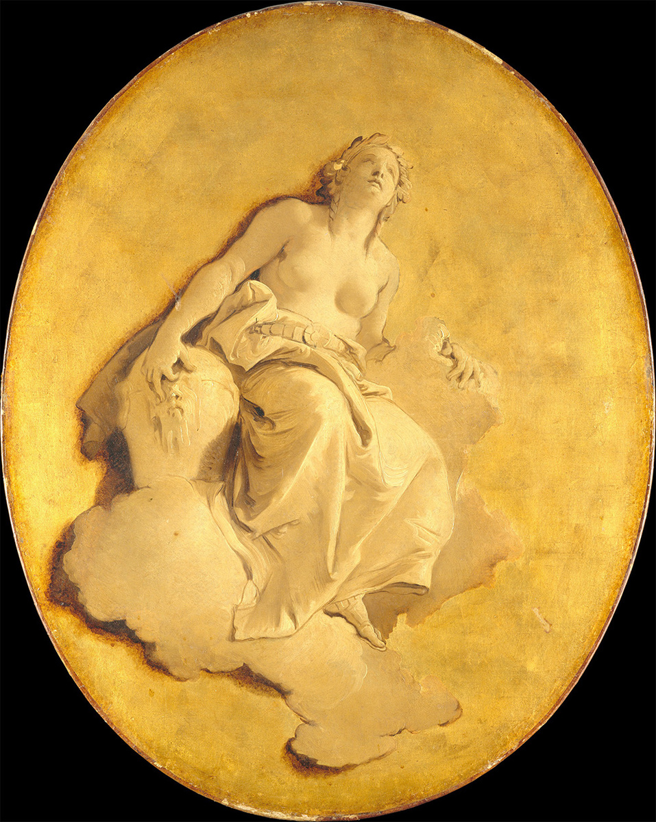 В качестве дополнения к повествовательному циклу в комнате, будь то фреска или картина маслом на холсте, итальянский художник Джованни Баттиста Тьеполо (1696–1770) часто писал монохромные аллегорические фигуры на нейтральном фоне, имитирующем мрамор или золото. Предназначенные для имитации барельефной скульптуры, они были задуманы для размещения над дверями. Перед нами исключительно хорошо сохранившийся пример такой работы, имеющий парную картину, также подаренную Метрополитен-музею в 1984 году, и две аналогичные работы в Рейксмузеуме в Амстердаме, относится к этому типу декора. Атрибуты фигур слишком общие, чтобы позволить какую-либо конкретную идентификацию, и происхождение серии не прослеживается ранее двадцатого века. Однако, согласно инвентарю Джандоменико Романелли, серия из четырех наддверных картин, описанных в общем как "барельефы в технике светотени", составляла часть цикла декораций со сценами Ринальдо и Армиды, выполненных Тьеполо в одной из комнат дворца Корнаро в прих