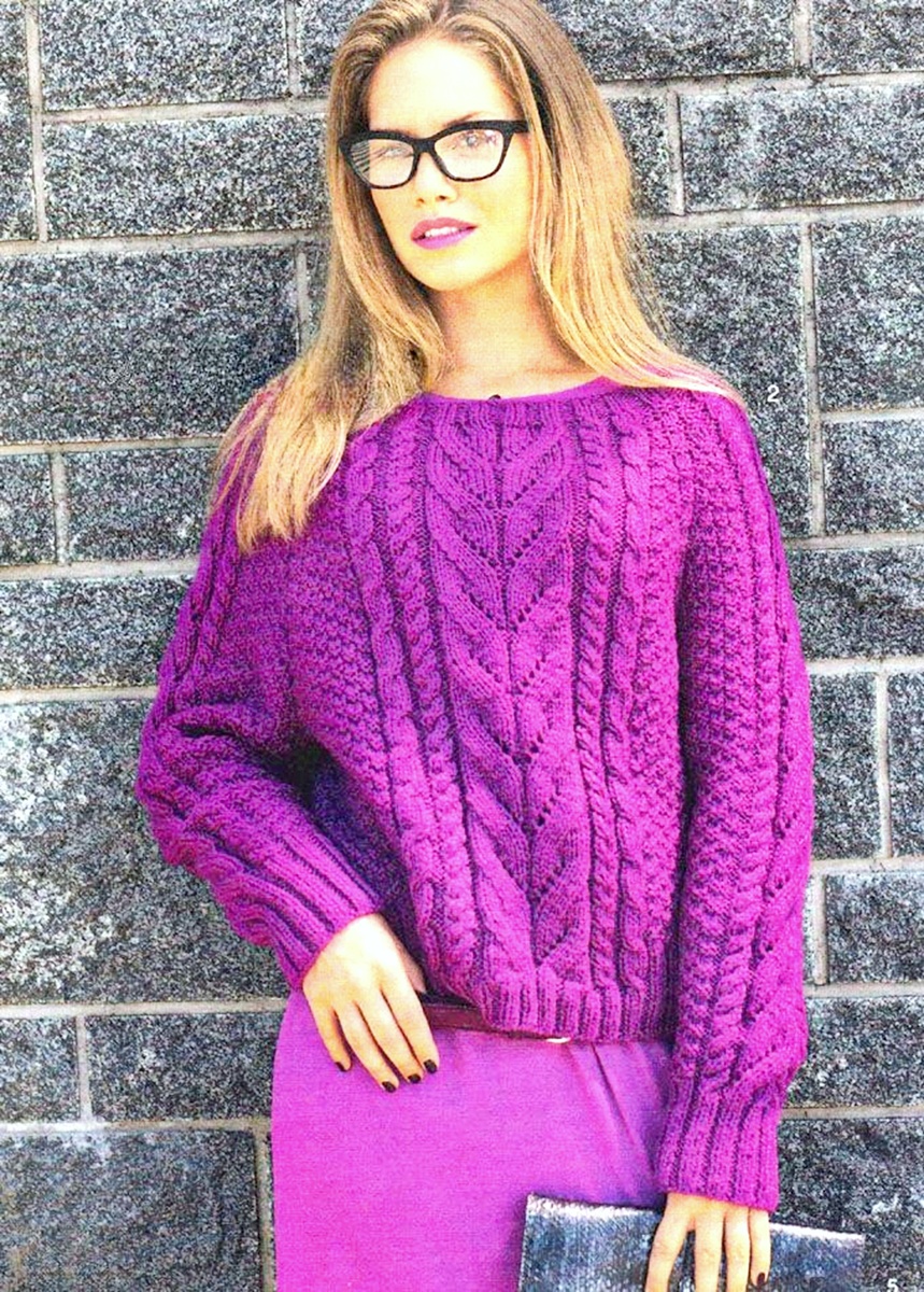 № 1: Пуловер цвета фуксии с ложной «косой» и мелкими жгутами ♥