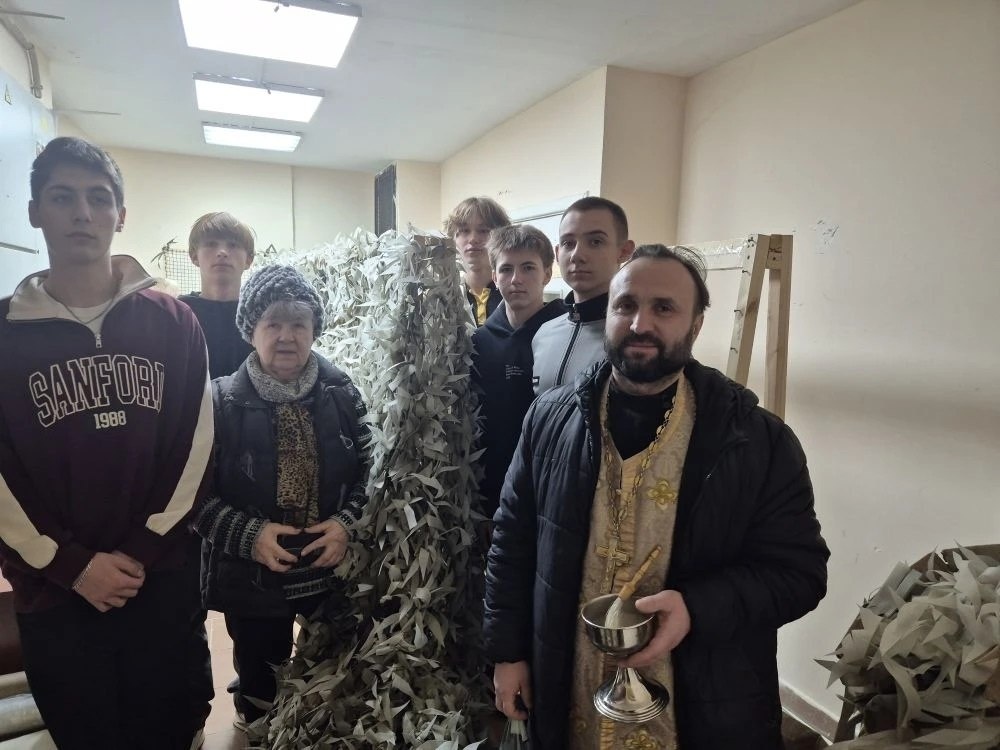 📦 Общественное объединение «Сети для СВОих» подготовило к отправке в зону спецоперации очередную партию маскировочных изделий – сетей, нашлемников, накидок, а также гуманитарную помощь для жителей Луганска. В помещении, где мастерицы ведут работу, священник Александр Маслий отслужил молебен и освятил упакованный груз. Эта благочестивая традиция сформировалась около двух лет назад, и теперь клирики Георгиевского прихода освящают каждую новую партию гуманитарной помощи. «Однажды после церковной службы я обратилась с такой просьбой к настоятелю, отцу Александру Суворкину, и он сразу согласился помочь, – вспоминает основательница объединения Татьяна Воробьёва. – Так и началась наша дружба. Теперь уже и прихожане храма приходят к нам плести сети, работают всегда с молитвой». Верующих много и среди мастериц. За ленточкой большинство бойцов тоже просят заступничества у Бога. Татьяна Воробьёва рассказывает, что они с соратницами обязательно упаковывают в посылки не только письма со словами