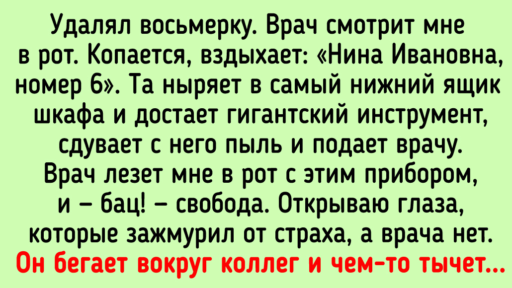 Удалял восьмерку. Врач смотрит мне в рот. Копается, вздыхает: «Нина Ивановна, номер 6». Та ныряет в самый нижний ящик шкафа и достает гигантский инструмент, сдувает с него пыль и подает врачу. Врач лезет мне в рот с этим прибором, и — бац! — свобода. Открываю глаза, которые зажмурил от страха, а врача нет. Он бегает вокруг коллег и чем-то тычет. Тычит им моим зубом: «Смотрите, какой большой!» © RadiyMagadan / Pikabu