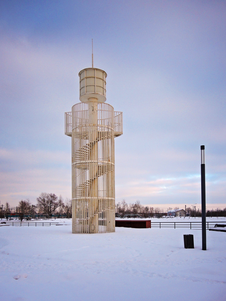 Завершение зимней фотопрогулки по Кинелю (Самарская область). Выбрался сюда в новогодние каникулы сезона НГ2026, чтобы посмотреть, как украшен город. Поездка была совсем короткой, но кроме новогодней иллюминации успел побывать ещё на паре точек. Практически весь материал из этой поездки показал. Осталась последняя часть. Это парк на Крымском озере. Локация довольно красивая. Во многом, потому что новая. Берег озера привели в порядок в 2021 году. Проект получился довольно интересным. Правда, оказалось, что зимой здесь делать особо нечего. Само озеро, конечно, замерзло. Клумбы и фонтан, конечно, не работают. Сезонных украшений никаких нет. Да и дорожки почти все не чищеные. Так что сюда лучше приезжать в тёплое время года. Для сравнения, в конце статьи можно найти ссылки на рассказ об осенней прогулке. На входе в парк со стороны улицы Крымской установлен главный арт-объект в виде маяка. В целом общее оформление территории имеет отсылки к морской теме, видимо, в привязке к названию озера.