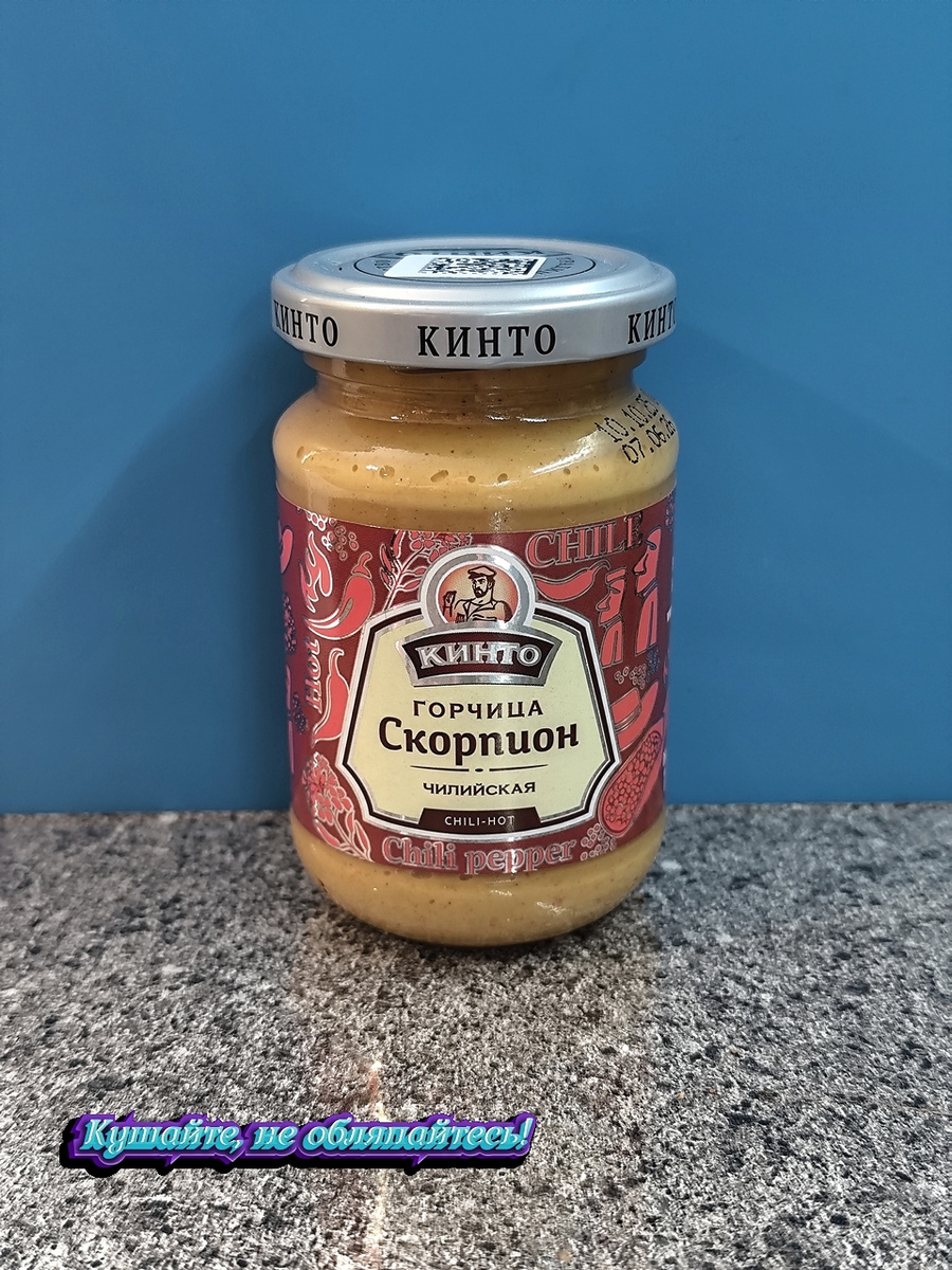 Нашел в "Перекрёстке" ещё одну острую горчицу, на сей раз отечественную, марки "Кинто". По названию я предположил, что горчица сделана с использованием перца Тринидадский скорпион (самый острый перец в мире в 2011 году). Но нет, в горчице обычный чили. Посмотрим, что производитель рассказывает о своём продукте: Горчица чилийская «Скорпион» ТМ КИНТО – это удивительно острая и ароматная горчица, которая восхищает своим пикантным вкусом и неповторимым характером.