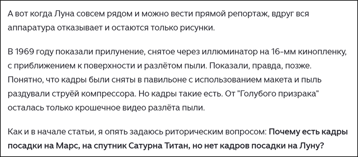 В 1969 г. показали прилунение, снятое через иллюминатор ... Понятно, что кадры были сняты в павильоне с использованием макетов (с) Коновалов