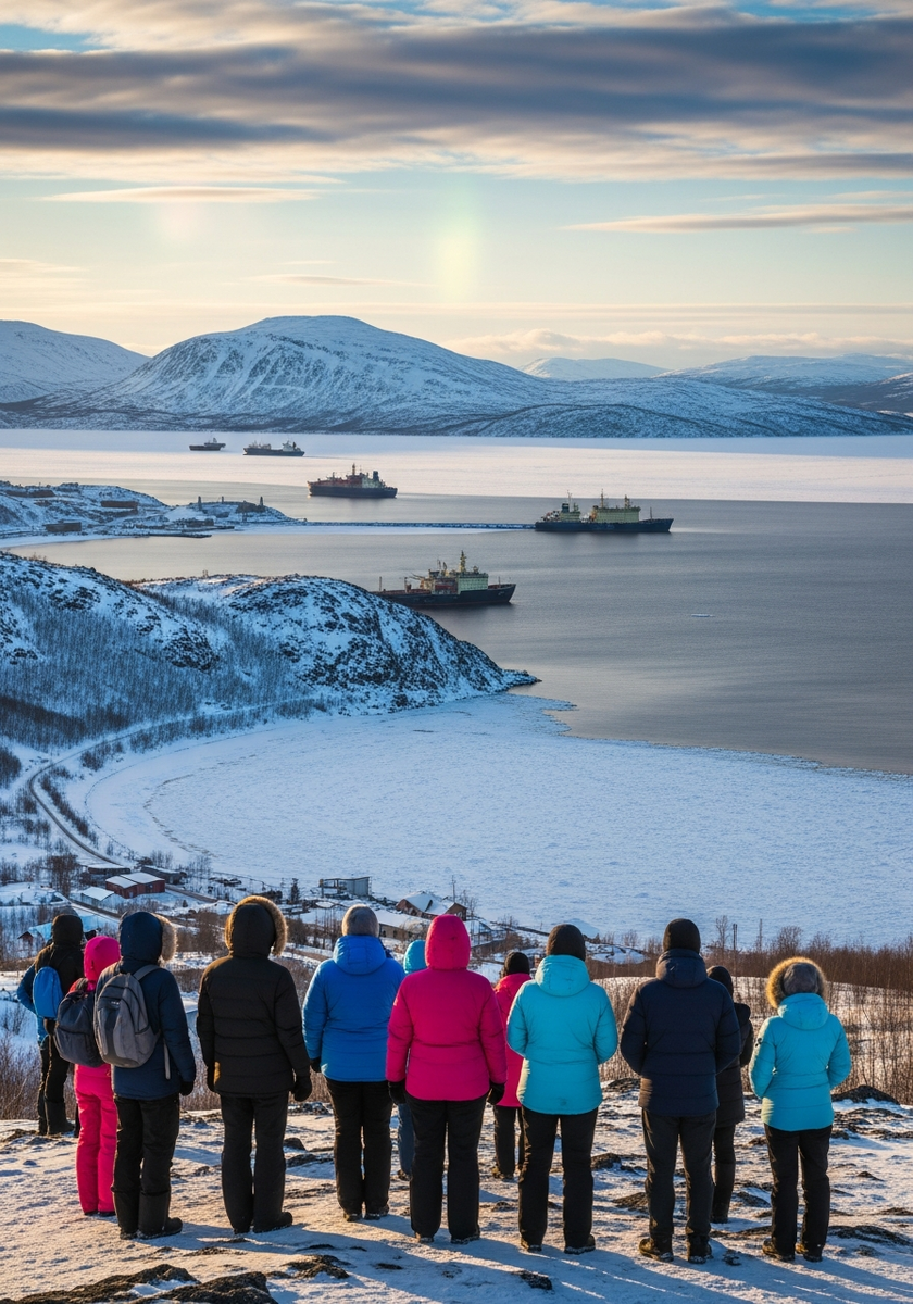 Лучшая панорамная точка для фотографий Мурманска, расположенная на противоположном берегу Кольского залива. Отсюда город виден как на ладони — порт, краны, корабли, разноцветные дома на склонах сопок и величественный силуэт Алёши на вершине.