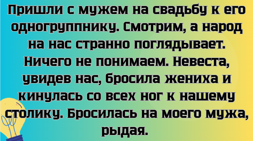 - Пришли с мужем на свадьбу к его одногруппнику. Смотрим, а народ на нас странно поглядывает. Ничего не понимаем. Невеста, увидев нас, бросила жениха и кинулась со всех ног к нашему столику. Бросилась на моего мужа, рыдая. Оказалось, она в моего мужа всю жизнь была страстно влюблена, о чем он не знал. Все, абсолютно все были в шоке. © Алина Перова