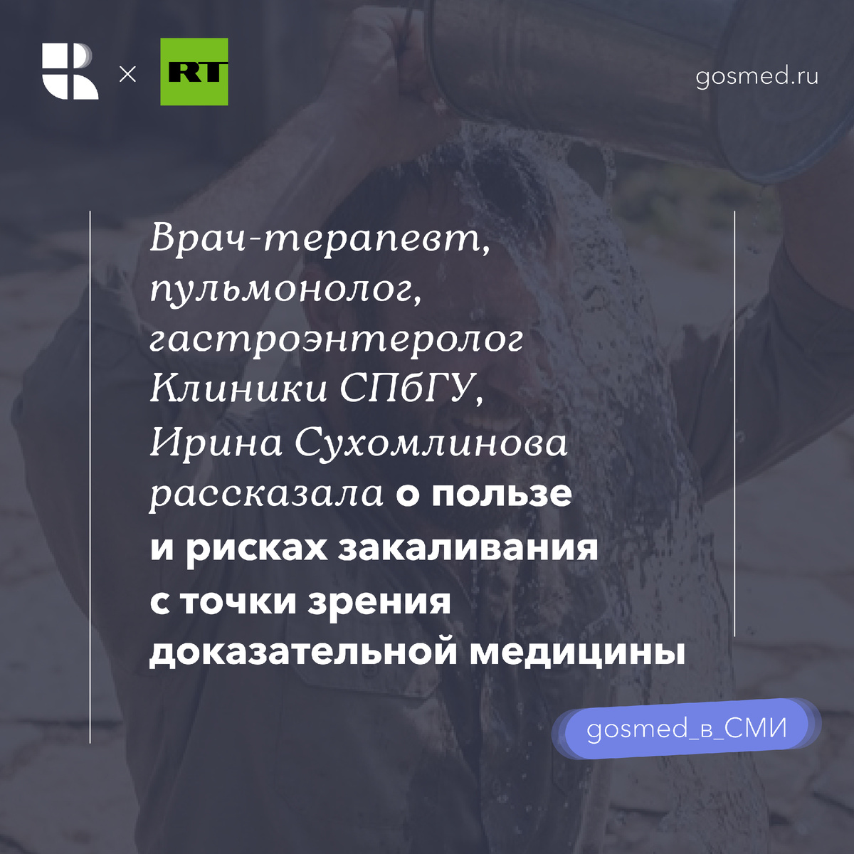 Ирина Сухомлинова, врач-терапевт, пульмонолог, гастроэнтеролог Клиники высоких медицинских технологий им. Н.И. Пирогова СПбГУ, выступила в роли эксперта крупнейшего международного новостного медиаканала RT.com. В статье, опубликованной на сайте издания, она подробно рассказала о пользе и рисках закаливания с точки зрения доказательной медицины. По словам Ирины Михайловны, ключевой эффект закаливания — не в усилении иммунитета, а в тренировке адаптационных механизмов нашего организма, и в первую очередь — сосудов. Эксперт объяснила, почему экстремальные методы закаливания вроде ледяных ванн — это лишь дозированный стресс, чья польза проявляется только на фоне здорового образа жизни. Отдельное внимание врач уделила сезонным традициям — она рассказала, с какими серьёзными рисками для сердечно-сосудистой системы сопряжены разовые «испытания» холодом, подобные крещенским купаниям, и почему они не имеют ничего общего с оздоровлением. В ходе беседы поднимаются и другие важные вопросы: какие