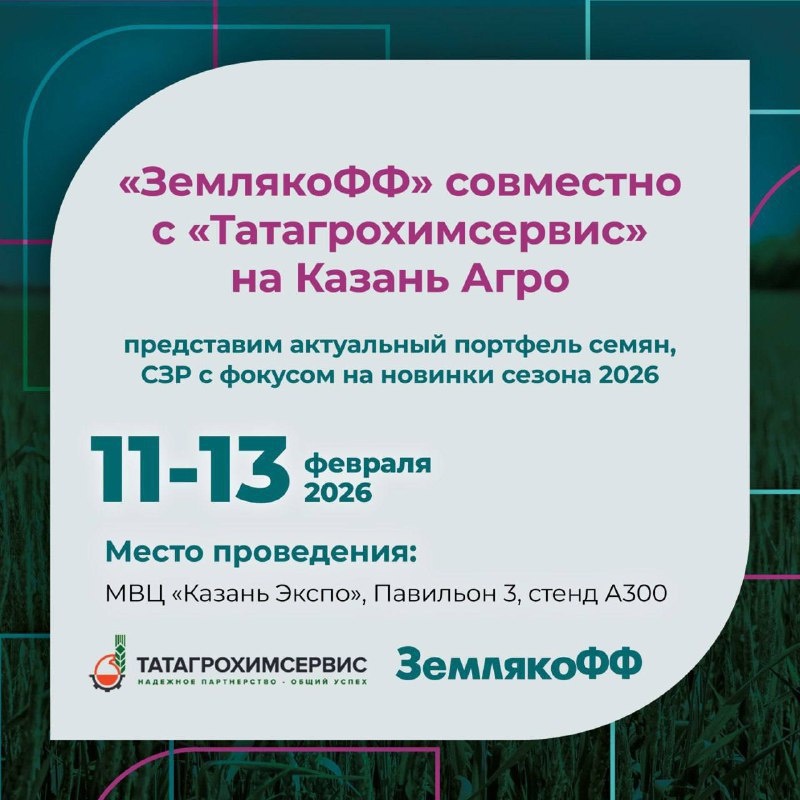 »! 🚀 "ЗемлякоФФ" совместно с "Татагрохимсервис" приглашает вас на специализированную сельскохозяйственную выставку достижений АПК, которая пройдет с 11 по 13 февраля! 🚜 Вас ждет: 🟢 Актуальный портфель семян и СЗР с акцентом на новинки сезона 2026! Узнайте первыми о самых эффективных решениях для вашего урожая. 🟢 Презентация наших новых научных проектов: "Озимый рапс в Республике Татарстан" и "КАС для урожайности Татарстана". 🟢 Подробные результаты 3-го сезона проекта "Соя в РТ" и итоги демопосевов – цифры, выводы и практические рекомендации для успешного выращивания сои. 🟢 Индивидуальные консультации и подбор решений под конкретные задачи хозяйств. Мы здесь, чтобы помочь вам достичь лучших результатов! 📍 Где нас найти: МВЦ «Казань Экспо», Павильон 3, стенд А300 ✉️ Не забудьте зарегистрироваться для посещения выставки: https://kazan-agro.ru/ Приходите на наш стенд! Будем рады лично встретиться, ответить на ваши вопросы и поделиться ценным опытом! 🤝