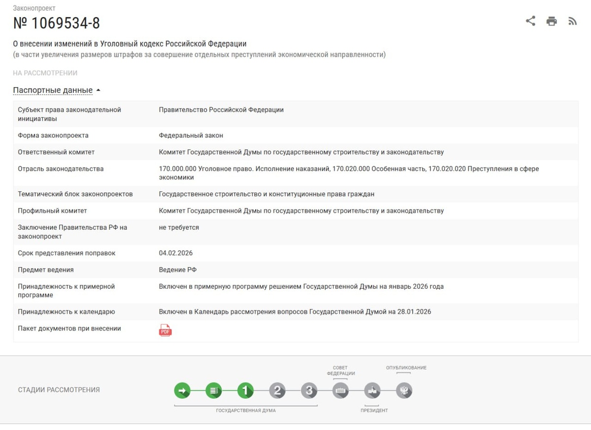 🚨 Госдума приняла в первом чтении Законопроект № 1069534-8, который кратно увеличивает штрафы по более чем 30 статьям УК РФ в сфере экономики. На фоне повышения налогов с 2026 года государство синхронно ужесточает и ответственность. ПРЕДЛАГАЕМЫЕ ИЗМЕНЕНИЯ: 📌 Налоговые преступления: Уклонение от уплаты налогов (ст. 199 УК РФ) - штрафы вырастут в 5 раз.