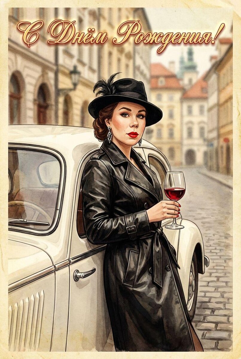 Модель: Nano Banana Сгенерировать🪄 Создать винтажную открытку на основе загруженной фотографии в стиле советских праздничных иллюстраций 1950–1970-х годов. !!! ОБЯЗАТЕЛЬНО сохрани все черты лица без малейших изменений: глаза (форма, цвет, разрез), нос, губы, овал лица, брови. !!! ОБЯЗАТЕЛЬНО напиши на открытке русский текст "С Днём Рождения!" ОБЩИЙ СТИЛЬ Мягкая живописная иллюстрация с эффектом старой печатной открытки Лёгкая ретро-патина, слегка пожелтевшая бумага Атмосфера тепла, уюта и праздника Акварельная текстура, зернистость бумаги. ТЕКСТ ПОЗДРАВЛЕНИЯ Содержание: «С Днём Рождения!» Расположение: Внизу или вверху открытки Не закрывает лицо персонажа Шрифт: Изящный рукописный Сказочный стиль советских открыток 1950–1970-х Оформление: Цвет: тёплый красный или золотистый Лёгкое сияние Тонкая тень для читаемости КОМПОЗИЦИЯ И ФОРМАТ Ориентация: вертикальная открытка.Девушка с фото позирует на фоне винтажного автомобиля. Она одета в стильный образ, сочетающий э