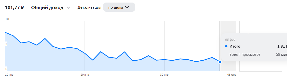 Доход упал. Слово доход берется как указатель абстрактного . И продолжает падать. Это очень неприятно, но это факт, с которым надо работать. Я собрала данные за 30 дней: 298 публикаций и всего 95,16 ₽ на выходе. В среднем — чуть больше тридцати копеек за статью. Медианное значение (то, что делит все публикации пополам по доходности) — около 47 копеек. А разброс — от 21 копейки до рекордных 18,49 ₽.