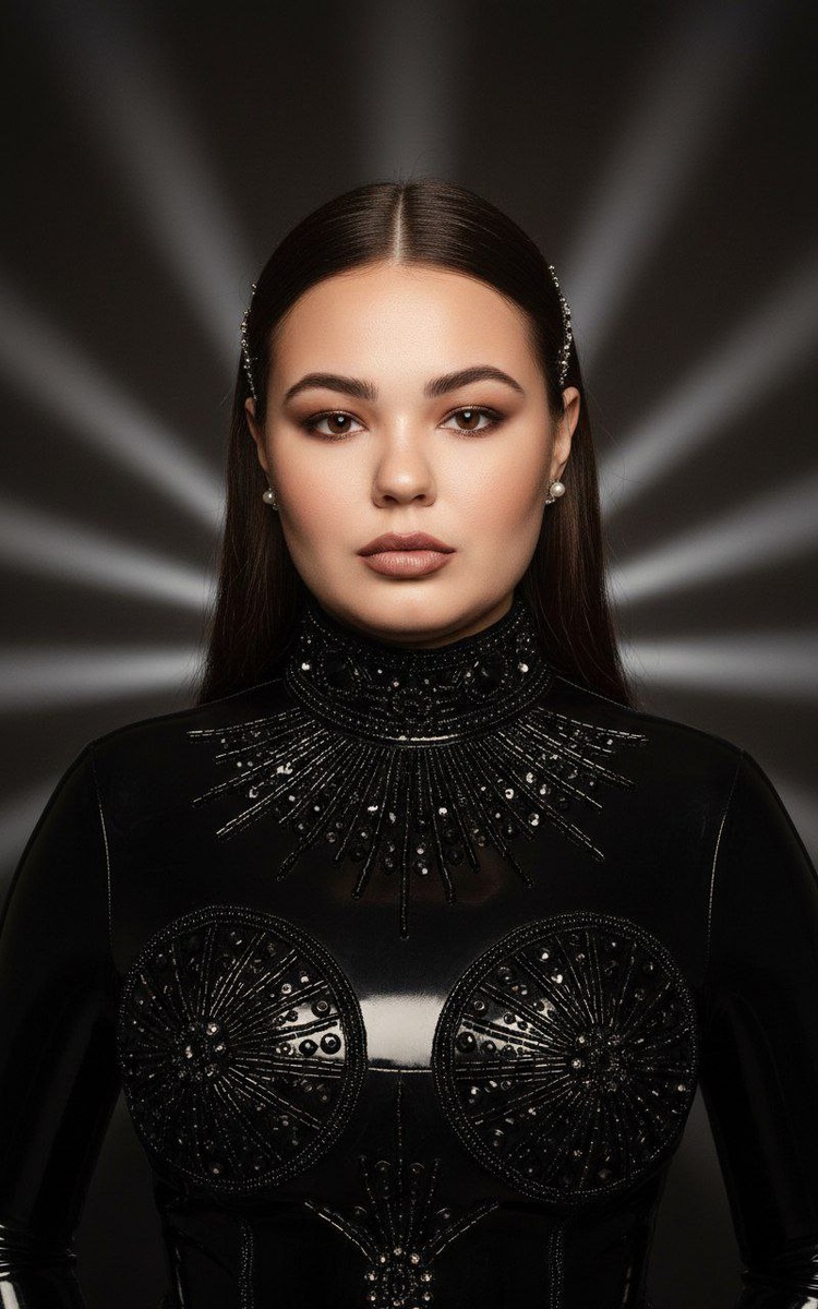 😀Выбираем "нейросети" 😀Нажимаем "Nano Banana" 😀Нажимаем "Nano Banana Pro" 😀Прикрепляем через скрепку свое фото и выбранный промпт 😀Наслаждаемся результатом😍 Создай фото не меняя черты лица и цвет волос. "Фотореалистичный студийный портрет по торсу: женщина в глянцевом чёрном облегающем топе с высоким расшитым воротником‑манишкой из чёрных бусин, пайеток и кристаллов; графичный тёмный фон с радиальными белыми лучами, контровые рим‑лайты, сильные отражения на ткани." Детали: ⦁ Одежда: облегающий глянцевый материал (латекс/лак/полиуретан), высокий украшенный воротник‑манишка, декоративные расшитые панели по грудной клетке. ⦁ Прическа: длинные тёмные прямые волосы с ровным пробором, аккуратные зажимы/детали у висков. ⦁ Макияж: профессиональный, безупречный. Губы покрыты светло-бордовой матовой помадой с контуром и блеском. ⦁ Аксессуары: мини‑серьги (платин/жемчуг), воротник‑акцент из кристаллов/стекляруса как главный элемент. ⦁ Поза и композиция: торс‑от‑груди вверх, плечи чуть от