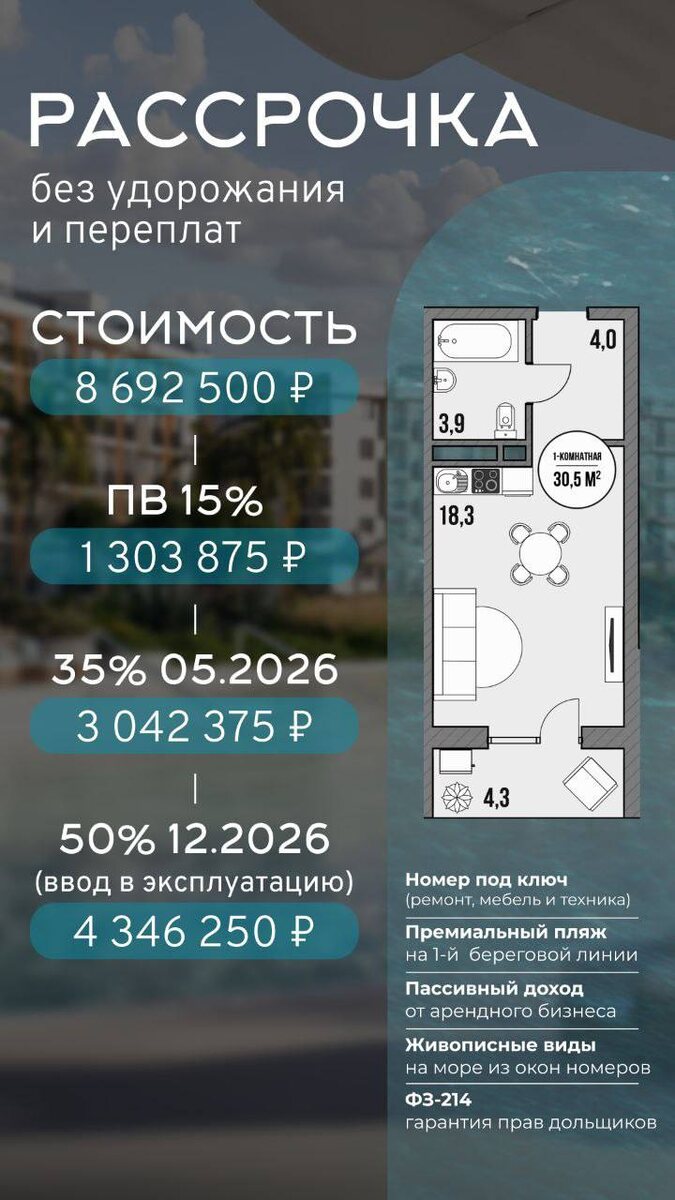 Номер под ключ с доверительным управлением Показываю самый доступный вход в проект, с которым сейчас работаю. Формат — гостиничный номер с профессиональным управлением, полностью готовый к сдаче: ремонт, мебель, оснащение — всё включено. Коротко о проекте — формат курортного отеля — управление Alean Select — номер передаётся полностью готовым — доход от 1,5 млн ₽ в год — сдача объекта — декабрь 2026 Рассрочка от застройщика Можно заходить без банка, с поэтапной оплатой: • 15% сейчас — 1 303 875 ₽ • 15% — март 2026 — 1 303 875 ₽ • 20% — июнь 2026 — 1 738 500 ₽ • 50% — до февраля 2027 — 4 346 250 ₽ В любой момент с рассрочки можно перейти на ипотеку. Ипотечные программы 👇 2,98% на 12 месяцев Стоимость: 9 939 313 ₽ ПВ: 1 997 802 ₽ Ипотека: 7 941 511 ₽ Платёж: 19 979 ₽ 5% на 18 месяцев Стоимость: 10 250 480 ₽ ПВ: 2 060 346 ₽ Ипотека: 8 190 133 ₽ Платёж: 34 407 ₽ Почему на это смотрят — готовый формат под аренду — управление федеральным оператором — прогнозируемый доход — можно