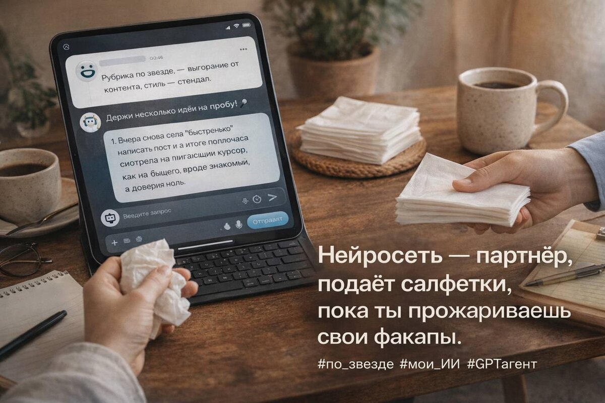И тридцать минут смотрела на мигающий курсор, как на бывшего: •вроде знакомый •вроде не враг •но доверия ноль. Мозг в этот момент включает режим «спасти хозяйку»: посуду помыть срочно Reels посмотреть жизненно важно прочитать «как перестать прокрастинировать» обязательно, но завтра. И вот тут в кадр выходит мой GPT-ассистент. Не как «я сейчас напишу за тебя». А как нормальный партнёр по стендапу: — «Так, с чего ржём?» — «Где боль?» — «Где ты опять облажалась, но смешно?» Я ему: « Рубрика по звезде. Тема выгорание от контента. Стиль стендап, без инфоцыганства». Он мне: хуки скелет направление удара А текст? Шутки? Интонация? Мой яд, мои тараканы, мой голос. ИИ тут не автор. Он мой соавтор по структуре. Редактор без эго. Человек, который не обижается, если ты его три раза послала и переписала всё заново. Если тоже устала воевать с пустым экраном и хочешь GPT-агента партнёра, а не «пиши за меня, я пошла»,смотри урок как настроить под себя chat GPT 👉 НАСТРОИТЬ CHAT GPT под себя