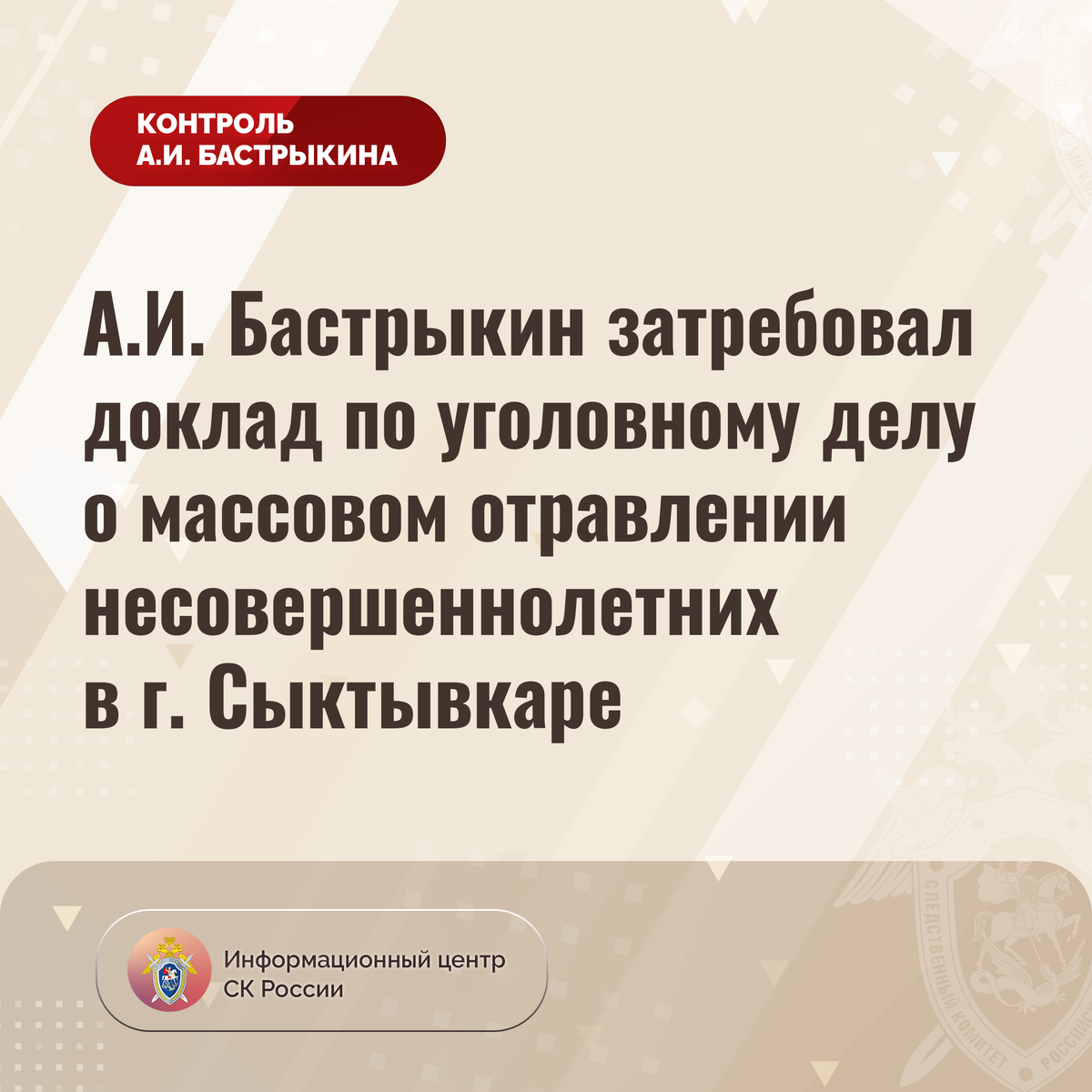 А.И. Бастрыкин затребовал доклад по уголовному делу о массовом отравлении несовершеннолетних в г. Сыктывкаре В сети Интернет сообщается о массовом отравлении детей в городе Сыктывкаре. В январе текущего года после употребления в пищу продуктов питания в столовых образовательных учреждений несовершеннолетние пожаловались на ухудшения самочувствия. В СУ СК России по Республике Коми возбуждено уголовное дело. Председатель Следственного комитета Российской Федерации Александр Иванович Бастрыкин затребовал у руководителя СУ СК России по Республике Коми Андрея Николаевича Исаева доклад о ходе и результатах расследования уголовного дела. Исполнение поручения поставлено на контроль в центральном аппарате ведомства. #СледственныйКомитет #СКРоссии #СК #ИЦСКР #ИнформационныйЦентр #АлександрБастрыкин #ПредседательСКР #КонтрольПредседателяСКР #КомментарийКонтроль #Коми
