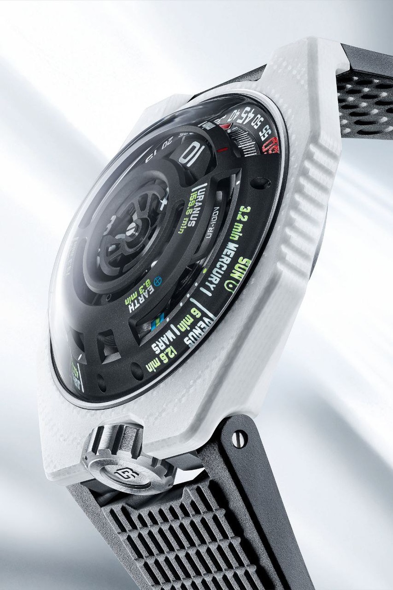 Urwerk представляет UR-100V LightSpeed Ceramic - модель, которая измеряет не только время, но и скорость распространения солнечного света до планет Солнечной системы. От 3,2 минут до Меркурия до 4,1 часа до Нептуна - часы воплощают космическую философию Мартина Фрея и Феликса Баумгартнера. Белый керамический корпус и открытая структура делают модель одновременно футуристичной и визуально лёгкой. Корпус и дизайн Корпус из белой композитной керамики с серебристыми стекловолокнами и углеродными вставками: ширина 43 мм, длина 51,73 мм, толщина 14,55 мм. Задняя крышка из DLC-титана с пескоструйной и дробеструйной обработкой. Завинчивающаяся заводная головка на 12 часах, водозащита 50 метров. Поставляется с двумя резиновыми ремешками - чёрным и белым с раскладной застёжкой. Циферблат и индикация Открытая черная структура с печатью восьми планет и временем в минутах/часах, необходимым свету для их достижения. Три вращающихся спутника показывают часы, красная стрелка с наконечником-стрелкой