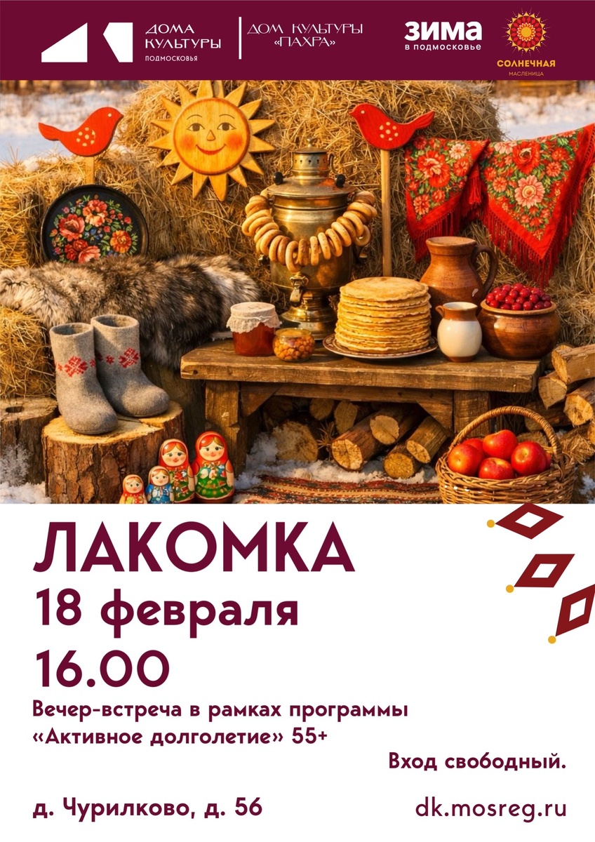 ✨ 🥞 Приглашаем вас на душевный вечер отдыха в рамках празднования Масленицы! Если вам 55+ и вы не привыкли скучать дома, ждем вас в нашем уютном кругу. В программе: любимые хиты прошлых лет, танцы, веселые конкурсы и, конечно, теплое общение за чашкой чая. ☕️🎶 Вспомним молодость, зарядимся энергией и просто отлично проведем время! 🌸 🚫 Возраст: 55+ 📆 18.02.2026🕒16:00 🏢 Сельский дом культуры (СДК) «Пахра» 📍 г.о.Домодедово, дер.Чурилково, ул.Чурилково, д.5Б 💰 Вход свободный❗️ ✅ Мероприятия Домодедово https://dzen.ru/id/66f10385cc4c5a16f7b5fb02 http://vk.com/domodedovo_events http://dzen.ru/domodedovo_events