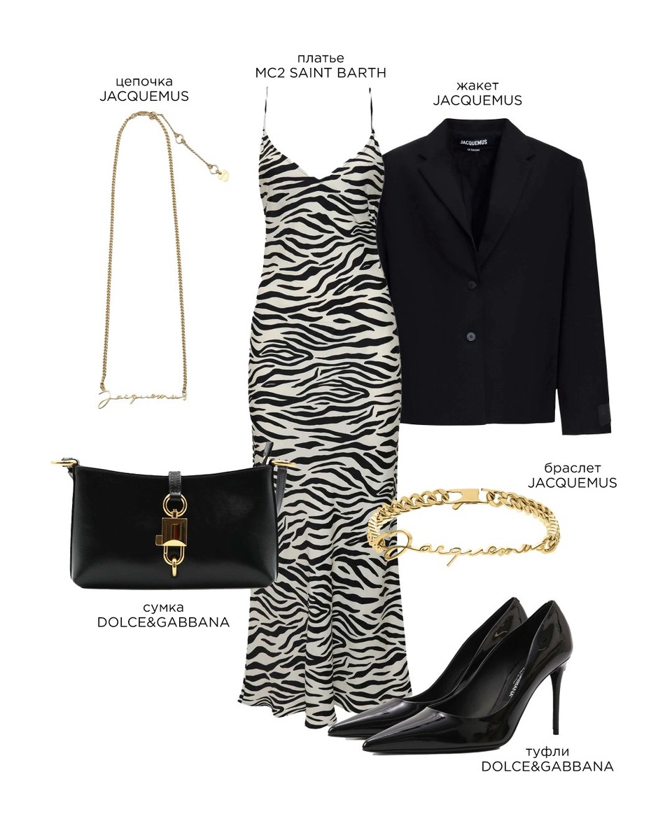 Свидание сегодня редко похоже на сценарий из романтического кино. Скорее это пауза между делами, разговор без заранее прописанных ролей и желание выглядеть уместно. Именно поэтому вопрос образа давно сместился из зоны «произвести впечатление» в область настроения и внутреннего комфорта. Современная романтика Романтичный образ не требует платья в пол или подчеркнутой хрупкости. Ключевой эстетикой вечерних выходов последних сезонов стала «тихая чувственность»: полупрозрачные фактуры, мягкий шелк, тонкая шерсть, текучий трикотаж. Визуально такие вещи выглядят нейтрально, но в движении и свете раскрываются иначе. ▫️ Платье-комбинация сложного оттенка вместо черного ▫️ Топ с деликатной прозрачностью без акцента на декольте ▫️ Украшения как деликатный акцент на линии шеи или запястья Платье, жакет, туфли, сумка, цепочка, браслет Структура как язык уверенности Если романтика кажется слишком очевидной, в ход вступает структура. Хорошо скроенный жакет, брюки с идеальной линией бедра, юбка миди