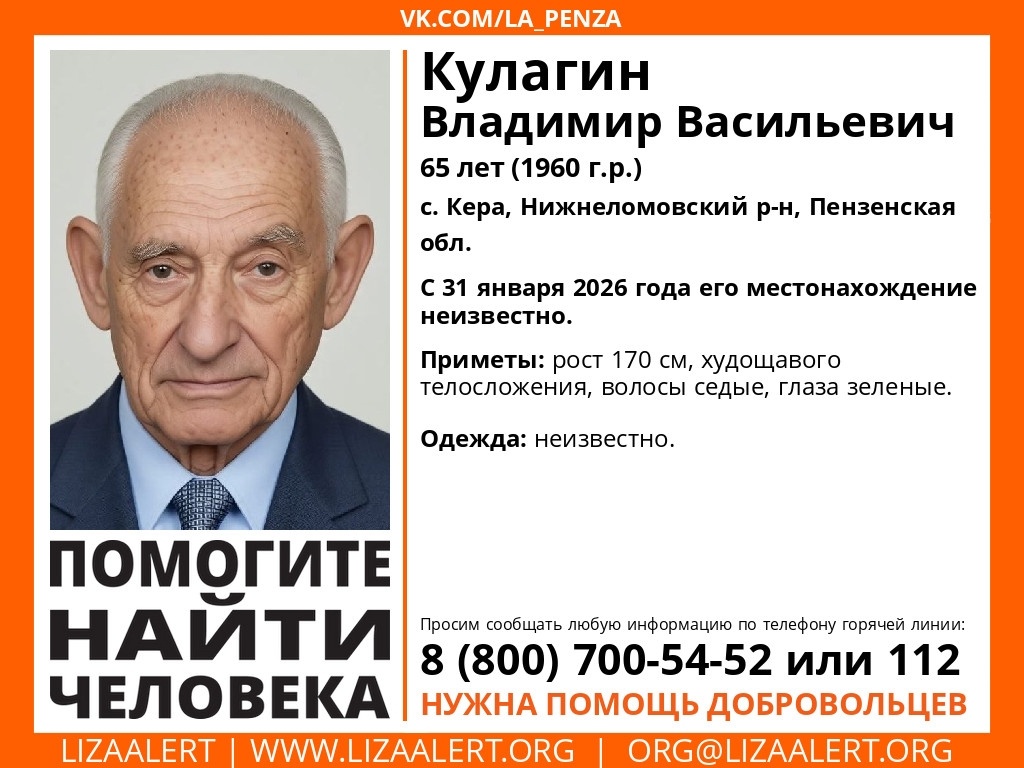 Волонтеры поисково-спасательного отряда «Лиза Алерт» объявили о розыске 65-летнего жителя Пензенской области. Ориентировку опубликовали 9 февраля. Владимир Васильевич Кулагин проживает в селе Кера Нижнеломовского района. По информации волонтеров, он пропал 31 января 2026 года, с этого дня о его местонахождении ничего не известно. Приметы пропавшего: рост около 170 сантиметров, худощавое телосложение, седые волосы, зеленые глаза. Во что был одет в день исчезновения, пока не установлено. Всех, кто располагает любой информацией, которая может помочь в поисках Владимира Кулагина, просят обратиться на горячую линию поискового отряда «Лиза Алерт» по телефону 8 800 700-54-52. Звонок бесплатный.