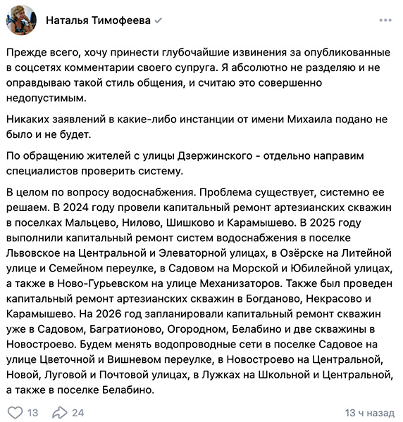 В соцсетях Озёрска в воскресенье, 9 февраля, разгорелся скандал. Итогом стали извинения главы администрации Натальи Тимофеевой перед жителями округа за комментарии супруга. Поводом для эмоциональных обсуждений послужило качество воды. На претензии жителей решил ответить муж главы администрации Михаил Тимофеев. «Вода плохая, глава приди и почини!!! Совсем все оборзели тут! Что ещё вам глава должна сделать? Есть депутаты, они принимают бюджет, вот с них и спрашивайте, какие дыры и каким образом затыкать! Поверьте, в адрес моей супруги я не позволю всяким аморальным людям высказываться, как им захочется», — гласил один из комментариев. Не обошлось и без угроз. «Прежде всего, хочу принести глубочайшие извинения за опубликованные в соцсетях комментарии своего супруга. Я абсолютно не разделяю и не оправдываю такой стиль общения и считаю это совершенно недопустимым. Никаких заявлений в какие-либо инстанции от имени Михаила подано не было и не будет», — написала Наталья Тимофеева на своей стра