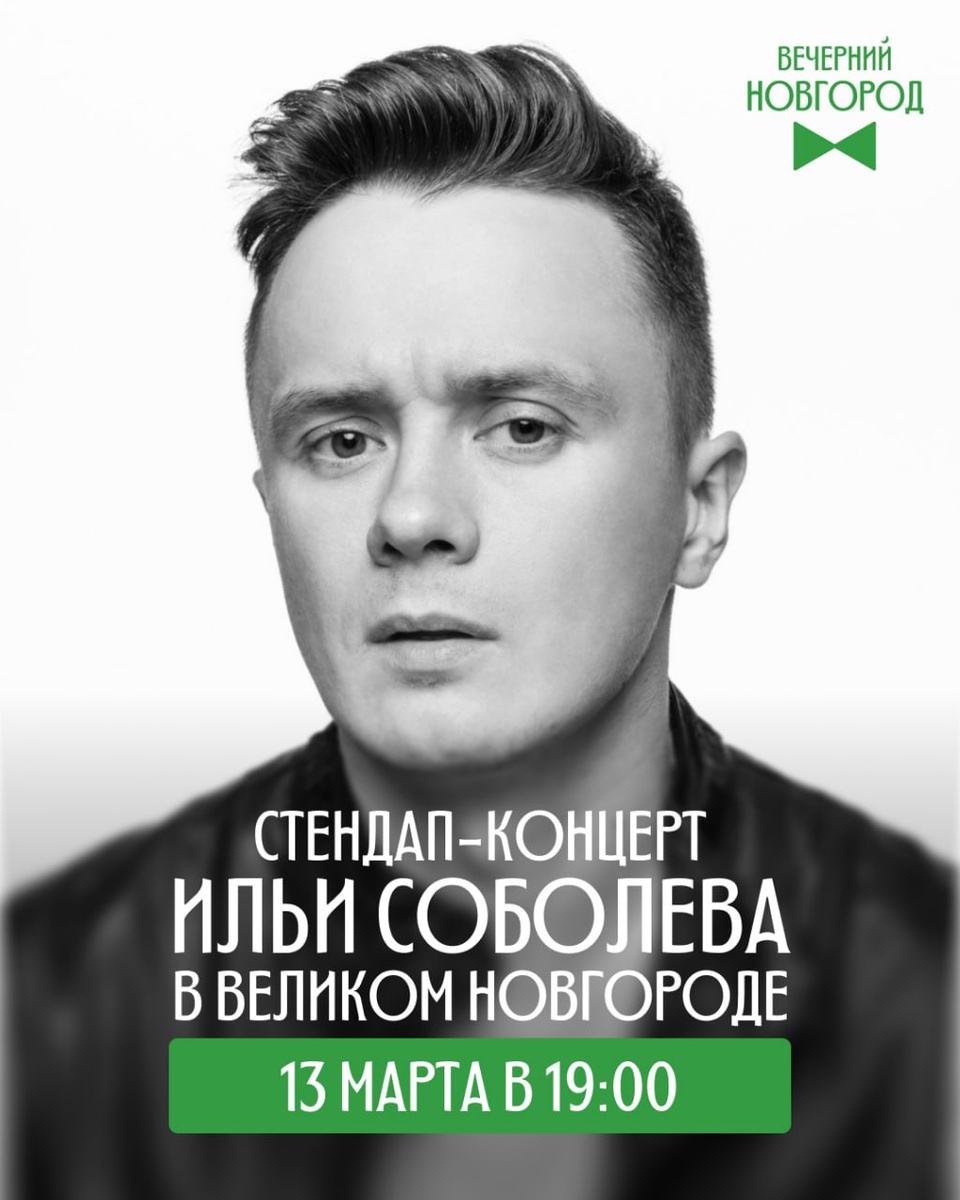 ⭐️ Илья Соболев — новая сольная программа в Великом Новгороде Один из самых ярких и непредсказуемых комиков страны — Илья Соболев — едет в Великий Новгород с новым стендап-концертом. Готовьтесь к абсурдным шуткам, безумным перформансам, экспрессивной подаче и фирменной импровизации, за которую его так любят зрители. Темы — знакомые каждому, но в интерпретации Ильи они превращаются в настоящее комедийное шоу с отыгрышами, неожиданными поворотами и мощной энергетикой. Вечер обещает быть громким и очень смешным. 🔥 13 марта, 19:00 ⚡ КЦ «Диалог», Большая Московская, 37/9 💲 Билеты здесь
