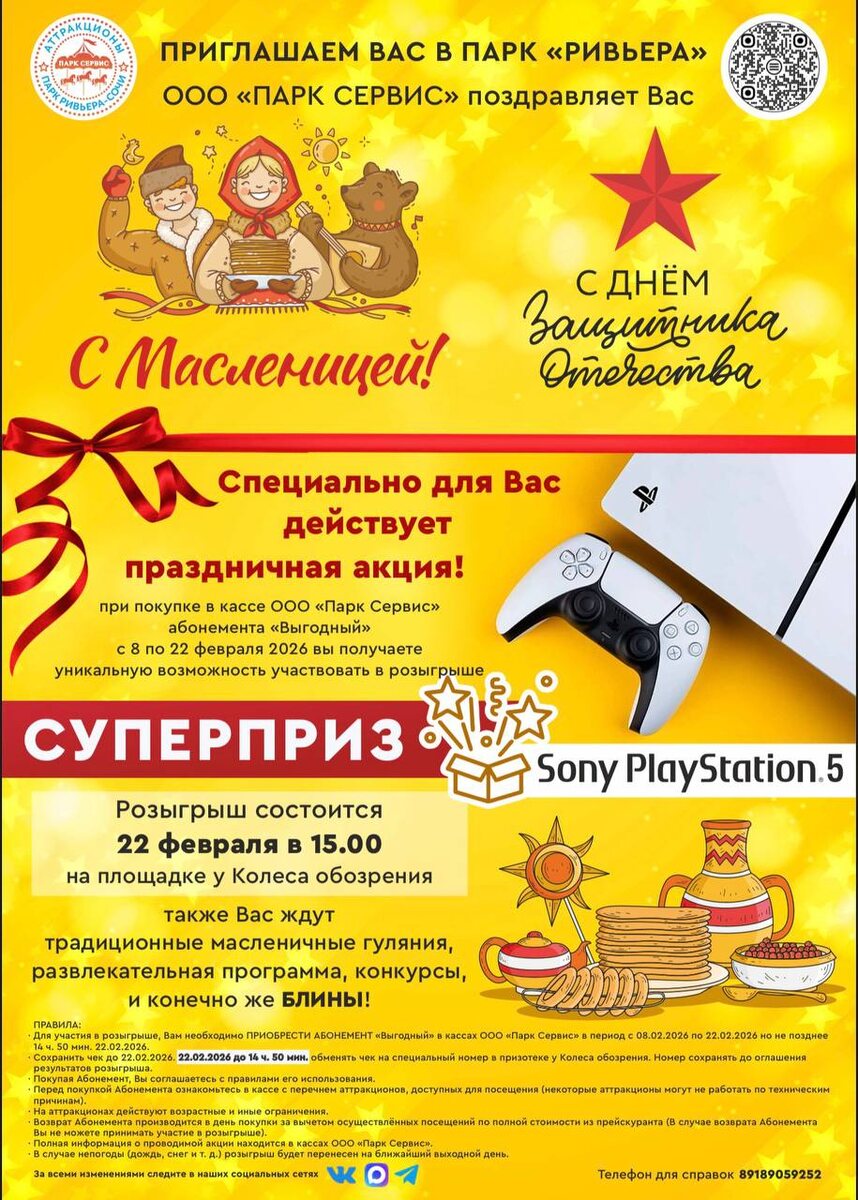 »! 🎉 Приглашаем вас на яркие масленичные гуляния в парк «Ривьера» — с атмосферой настоящего праздника, конкурсами, развлечениями и, конечно же, румяными блинами! ✨ Специально для вас — праздничная акция: С 8 по 22 февраля 2026 года при покупке абонемента «Выгодный» — в кассах парка — или онлайн на нашем сайте https://park-riviera.ru/tickets/ вы получаете уникальную возможность принять участие в розыгрыше СУПЕРПРИЗА — PlayStation 5 🎮 📍 Розыгрыш состоится: 🗓 22 февраля ⏰ в 15:00 📌 на площадке у Колеса обозрения В программе дня: — традиционные масленичные гуляния — развлекательная программа — конкурсы — и, конечно же, блины 🥞 Приходите всей семьёй, покупайте абонемент удобным способом и встречайте Масленицу ярко, весело и с шансом на главный приз! 💛 📞 Телефон для справок: 8 (918) 905-92-52