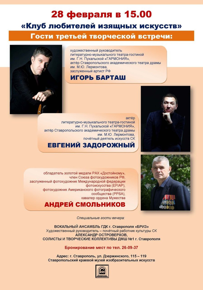 В экспозиционном зале Ставропольского краевого музея изобразительных искусств о жизни, секретах успеха, об истории и интересных событиях культуры нашего города и края расскажут три гостя. Это член Союза фотохудожников России Андрей Смольников, художественный руководитель литературно-музыкального театра-гостиной им. Г. Н. Пухальской «Гармония», актер Ставропольского академического театра драмы им. М. Ю. Лермонтова, заслуженный артист РФ Игорь Барташ и актер театра драмы им. М. Ю. Лермонтова, почетный деятель искусств СК Евгений Задорожный. Встречу в клубе украсят также специальные гости: ✔️вокальный ансамбль «Бриз» почетного работника культуры СК Александра Островерхова, ✔️педагог Детской музыкальной школы №1 Елена Земба вместе со своими учениками и коллегами. Они исполнят произведения мирового скрипичного репертуара. 🟠Где: ул. Дзержинского, 115 – 119. 🟠Когда: 28 февраля в 15:00. Количество мест ограничено, открыта бронь по тел.: 26-09-37. #анонссобытий | дайджест