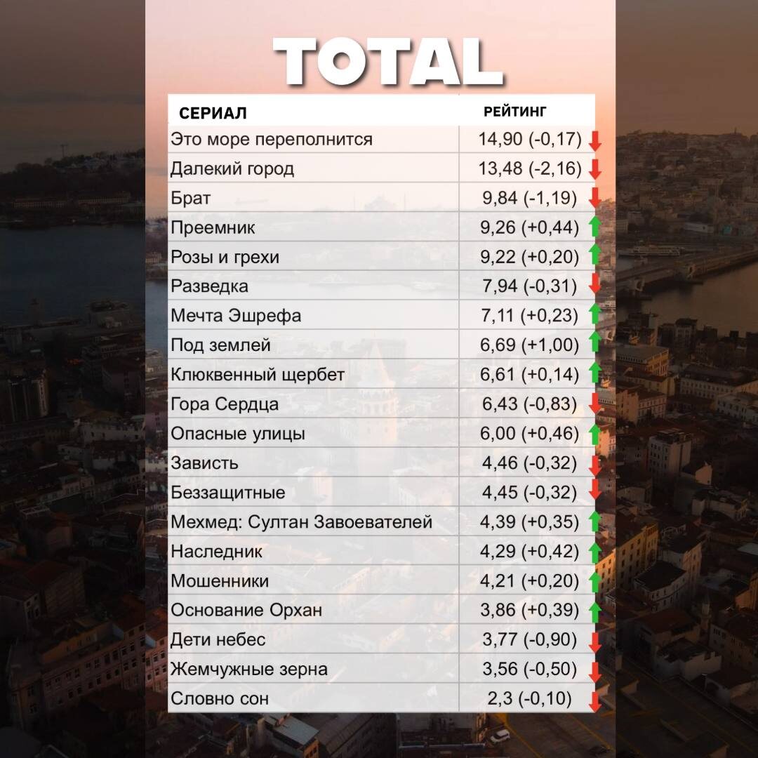 Прошедшая неделя оказалась насыщенной на события. Одни проекты подтвердили статус безусловных лидеров, другие столкнулись с резким падением, а новые сериалы только начинают борьбу за внимание зрителя. Разбираем, что происходило в эфире турецкого телевидения с 2 по 9 февраля и какие выводы можно сделать. Сериал «Это море переполнится» уверенно занимает 1 место во всех категориях — Total, AB и ABC1. Проект демонстрирует редкую стабильность и сохраняет высокий интерес аудитории, что в текущих условиях удается далеко не каждому. Можно с уверенностью сказать: сериал стал одним из главных телевизионных феноменов сезона. «Далекий город» показывает самое сильное падение недели, опускаясь на 2 место во всех категориях. Однако поводов для паники пока нет. В Турции на прошлой неделе отмечался важный праздник, что традиционно влияет на телесмотрение. С высокой вероятностью зрители вернутся к сериалу уже в ближайших сериях. Тем не менее ситуация осложняется тем, что в понедельник стартует амбициоз
