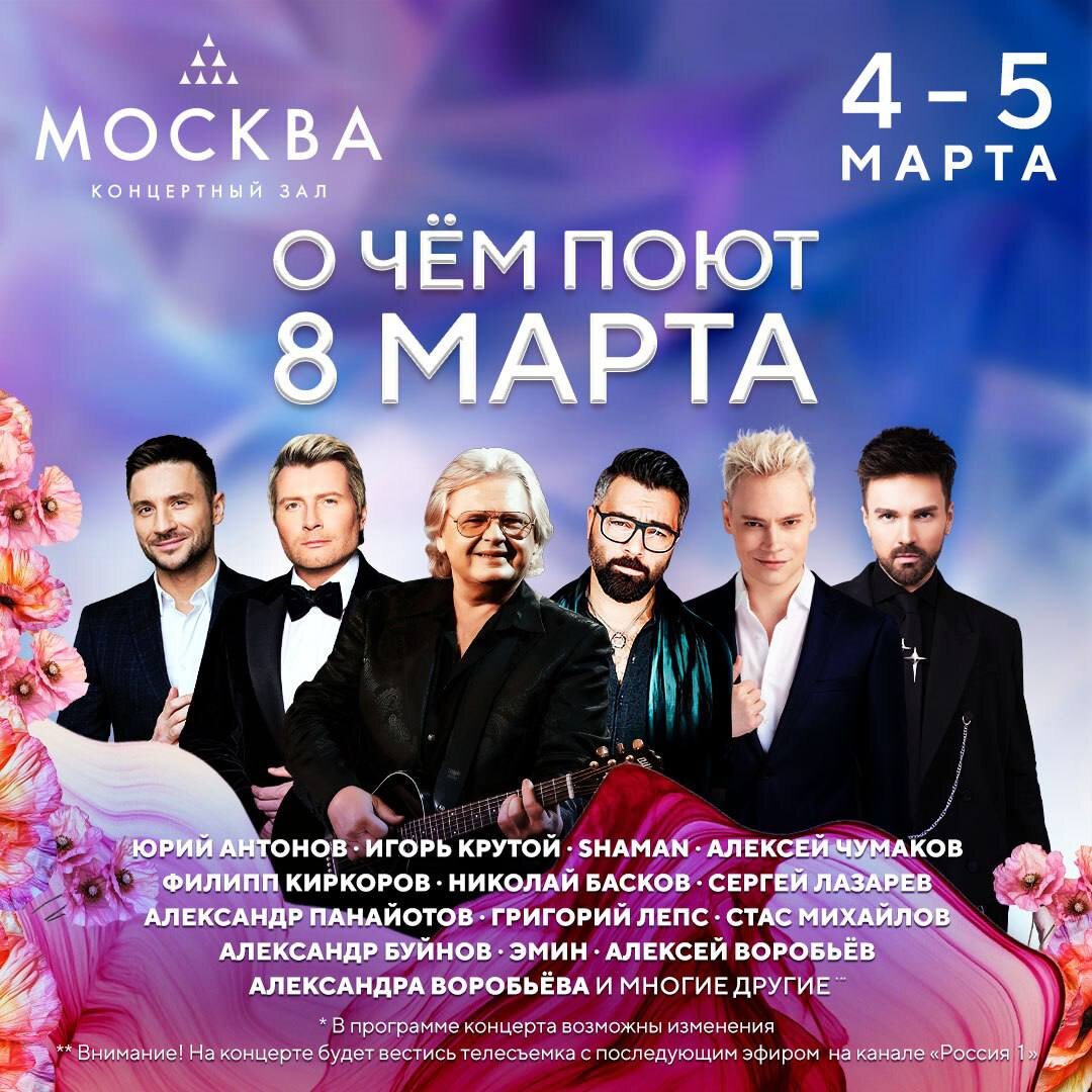 », посвящённый Международному женскому дню. Нам дали скидку -10% на билеты! Отличный подарок себе или родным и близким😉 В этот вечер на одной сцене соберутся главные звёзды российской эстрады, чтобы подарить зрителям незабываемые эмоции, яркие впечатления и весеннее настроение! Атмосферу праздника создадут самые популярные артисты страны: Юрий Антонов, Игорь Крутой, Shaman, Алексей Чумаков, Филипп Киркоров, Николай Басков, Сергей Лазарев, Александр Панайотов, Григорий Лепс, Стас Михайлов, Александр Буйнов, Эмин, Алексей Воробьёв, Александра Воробьёва и многие другие. ✔️В программе — лучшие хиты и новые песни о любви к прекрасным дамам. 🎫 БИЛЕТЫ по ССЫЛКЕ -10% по промокоду ПОЮТ292 на период 09.02-13.02.2026 ⏰ 4-5 марта в 19:00 📌Концертный зал «Москва» #концерт_кд 😍 Красота в деталях