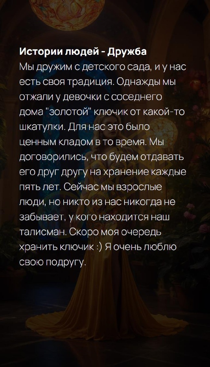 Истории людей - Дружба Мы дружим с детского сада, и у нас есть своя традиция. Однажды мы отжали у девочки с соседнего дома "золотой" ключик от какой-то шкатулки. Для нас это было ценным кладом в то время. Мы договорились, что будем отдавать его друг другу на хранение каждые пять лет. Сейчас мы взрослые люди, но никто из нас никогда не забывает, у кого находится наш талисман. Скоро моя очередь хранить ключик ) Я очень люблю свою подругу. #профессия #взаимовыручка2026 #чудо #жизненно #счастьеесть #жизньбезприкрас #позитив #чудорядом #вдохновение #профессия #взаимовыручка2026 #чудо #жизненно #счастьеесть #жизньбезприкрас #позитив #чудорядом #вдохновение Натальная карта | Архитектура вашей души T | VK | Pin | YouTub | Dzen Истории людей - Дружба Мы дружим с детского сада, и у на… #9число #9февраля
