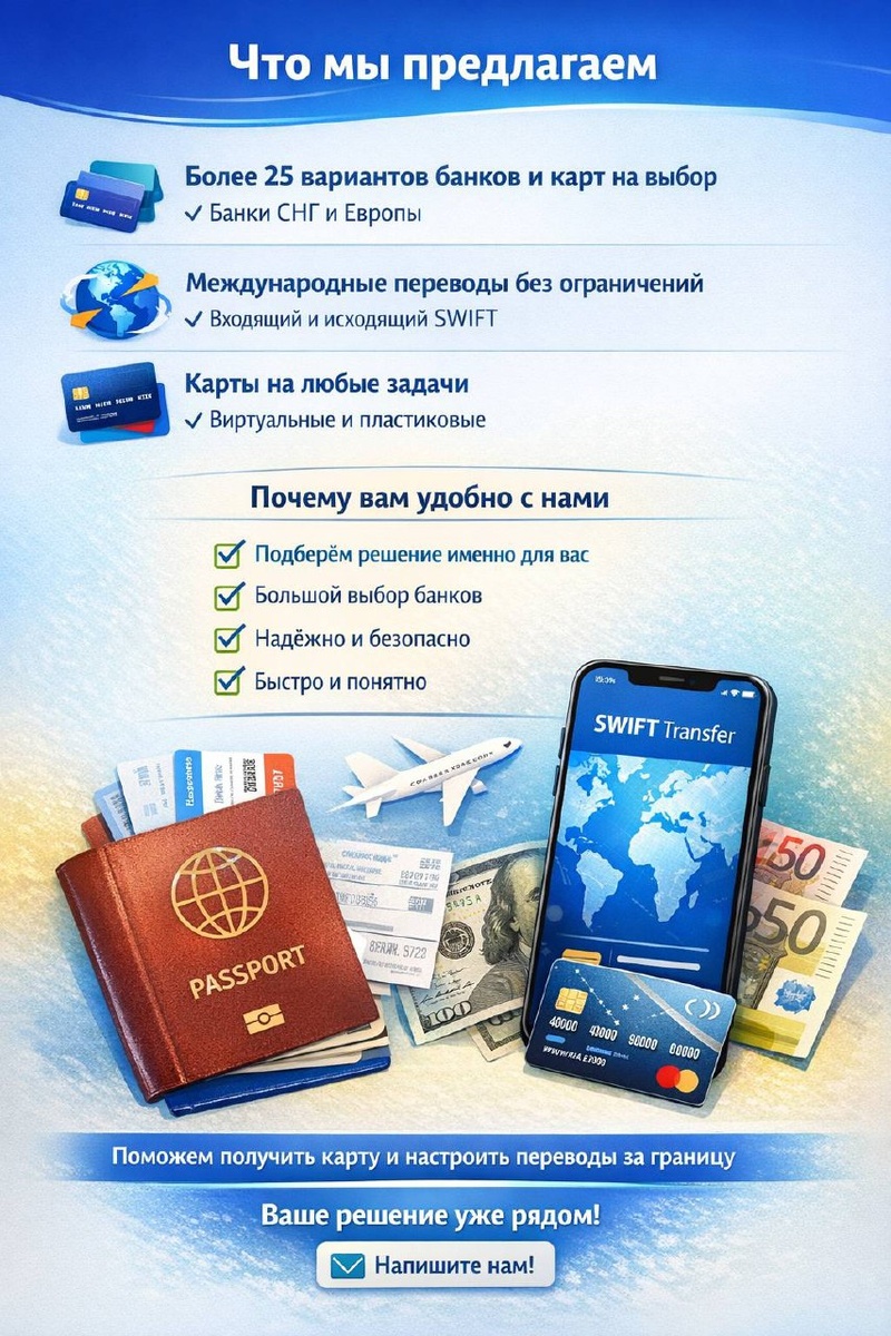 🔹 Более 25 вариантов банков и карт на выбор — банки стран СНГ — банки Европы и других стран 🔹 Полноценная международная платёжная инфраструктура — входящие и исходящие SWIFT-переводы — работа с международными переводами без ограничений «только внутри страны» 🔹 Карты под любые задачи — именные и неименные — виртуальные и пластиковые — с оформлением по доверенности и без неё ⸻ Почему клиентам удобно и выгодно работать с нами ✔️ Подбираем решение под вашу задачу, а не «что есть в наличии» ✔️ Широкий выбор банков — больше шансов найти подходящий вариант ✔️ Работаем только с проверенными банками и реальными кейсами ✔️ Понятная и быстрая коммуникация — без сложных формулировок и лишних шагов Мы сопровождаем вас на всех этапах — от подбора банка до получения карты и начала работы с международными переводами. 📩 Готовы проконсультировать и подобрать оптимальное решение под вашу ситуацию @Homevisa_office