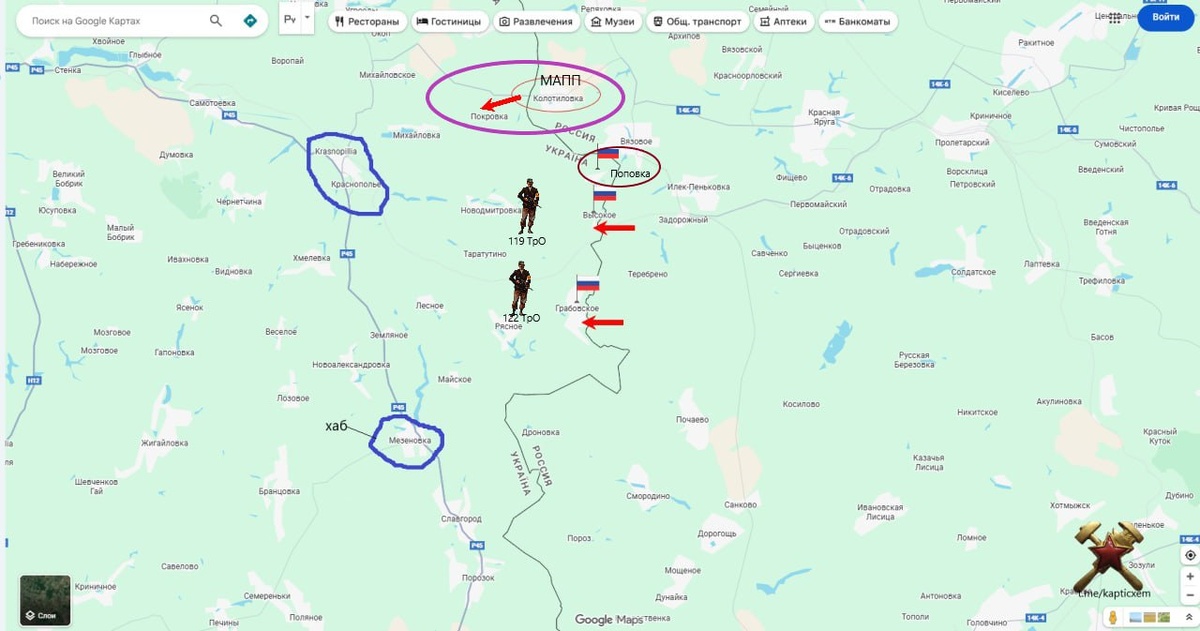 После взятия Поповки, наши штурмовики зашли в Покровку (фиолетовый овал) - это напротив МАПП Колотиловка