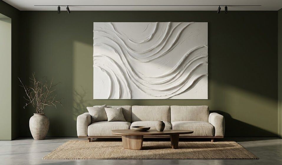 Белая фактурная картина - это классика. Она подходит ко всему. Но мы с вами создаем модный интерьер 2026.