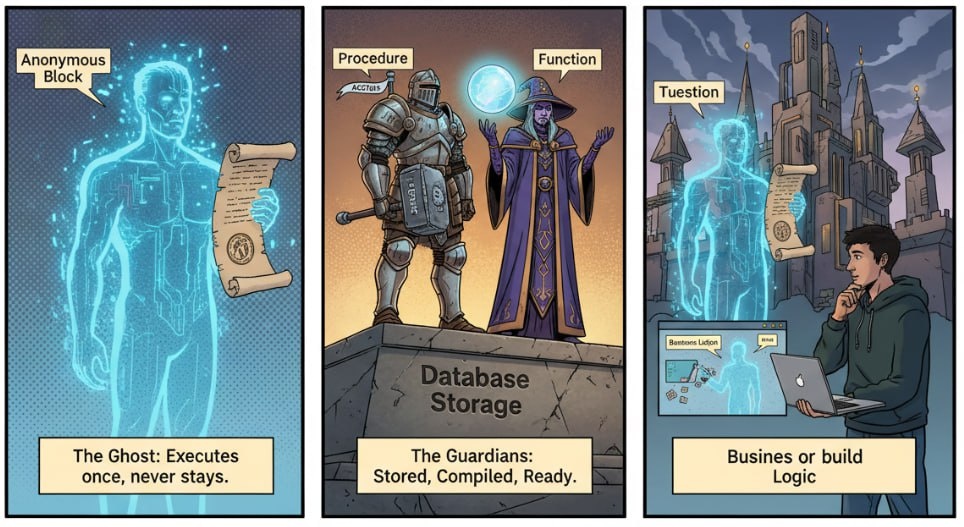? Коллеги, всем привет! С вами Денис 🤝 Пока оставим на немного Оптимизацию, и вспомним старый добрый PL/SQL 😊 Сегодняшний материал будет полезен джунам. Итак, многие начинающие разработчики путают анонимные блоки с хранимыми процедурами и функциями. Разберёмся в ключевых различиях и поймём, когда что применять. Основные отличия Анонимный блок - это PL/SQL-код, который выполняется один раз и не сохраняется в базе данных. Процедуры и функции - это именованные объекты, которые компилируются и хранятся для многократного использования. 🔹 Анонимный блок выполняется сразу и исчезает после завершения. Его нельзя вызвать повторно без повторной отправки всего кода. 🔹 Процедура сохраняется в БД, компилируется один раз и может вызываться многократно по имени. Не возвращает значение через RETURN, но может использовать OUT-параметры. 🔹 Функция также сохраняется в БД, но обязательно возвращает значение через RETURN и может использоваться в SQL-запросах. Практические примеры Анонимный бло