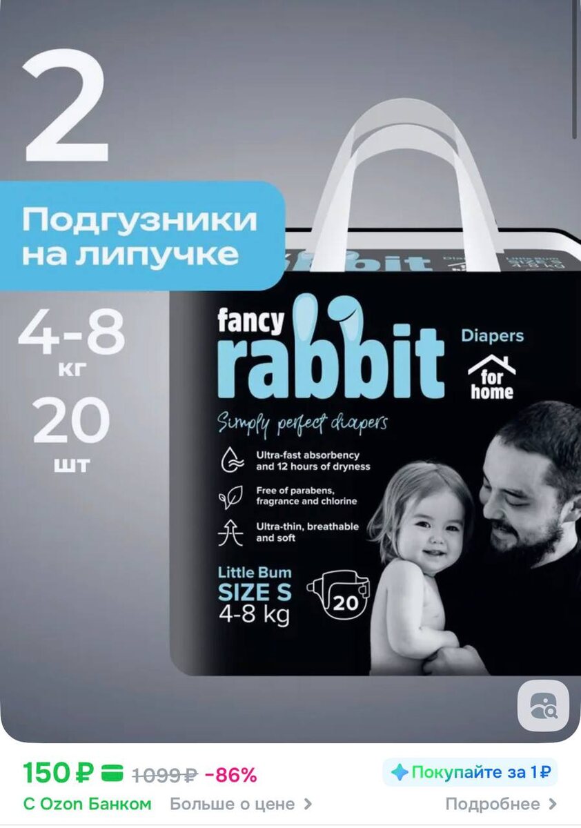 😀😀😀Подгузники детские на липучке FANCY RABBIT for home - размер 2 S (4-8 кг), 20 шт