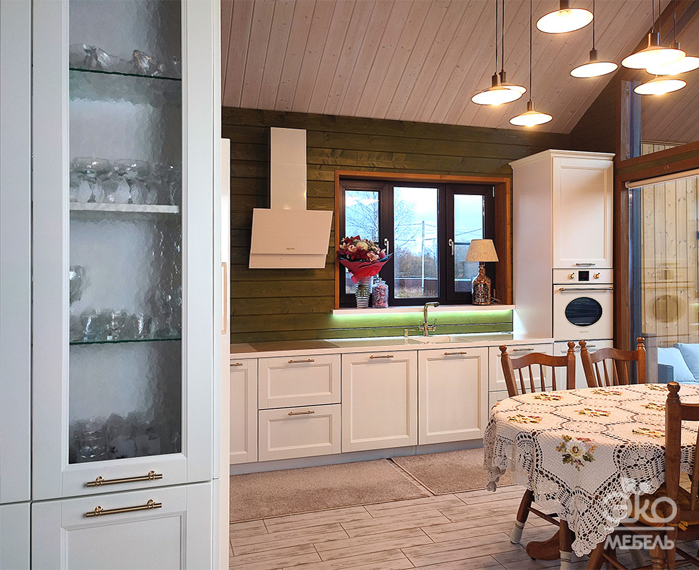 Сегодня хотим рассказать о сердце этого пространства — кухне-гостиной, где гармонично разместилась большая и вместительная угловая кухня из коллекции МАРТА, в тоне «Ваниль». Интерьер получился по-настоящему тёплым и домашним. Светлые рамочные фасады добавляют лёгкости и визуально расширяют пространство, а вместительные шкафы делают кухню максимально функциональной. Здесь продумано всё: удобное хранение, просторная рабочая зона и аккуратные детали в отделке.