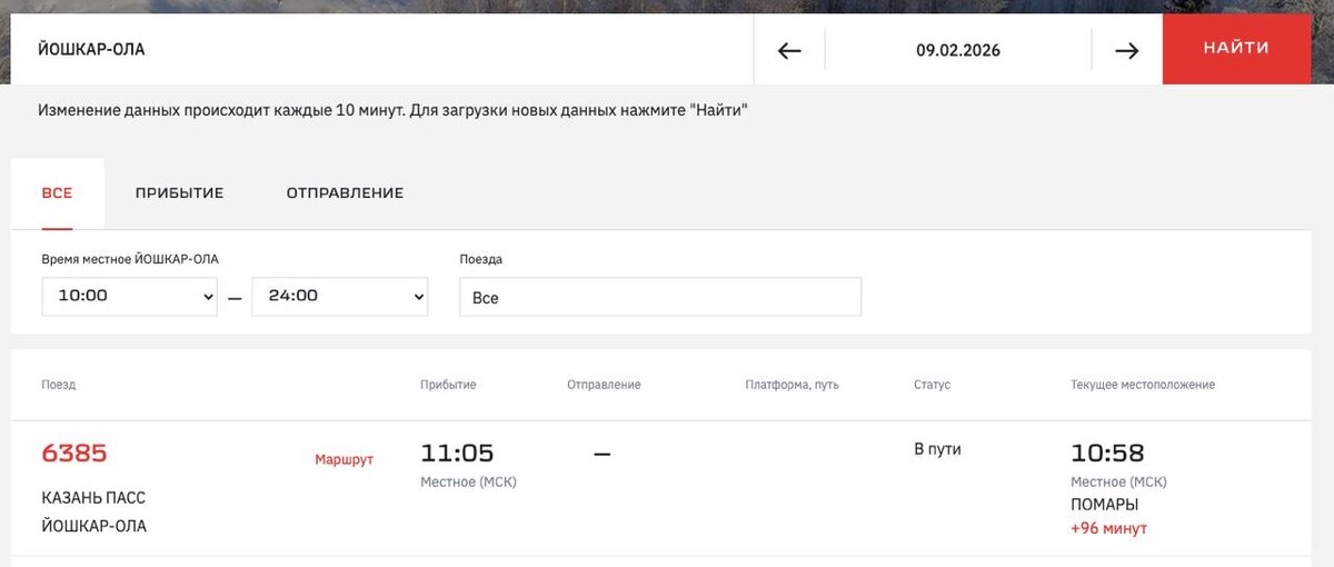 По данным онлайн-табло РЖД, состав должен был прибыть в столицу Марий Эл в 11:05, но по данным на 10:58 был в районе станции Помады. Сообщается, что поезд задерживается на 96 минут. Подписывайтесь на наш канал в МАХ!