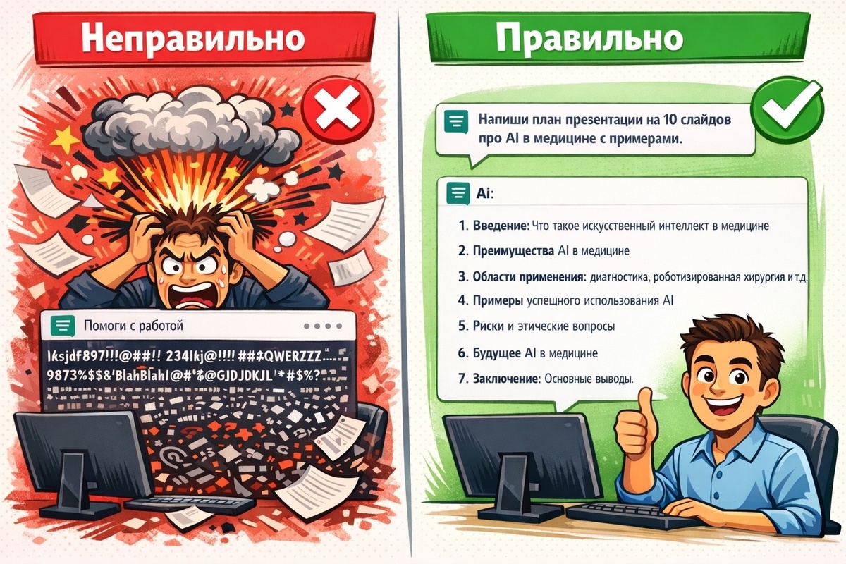 Представим ситуацию: вы спрашиваете ChatGPT что-то простое, а получаете ответ на три экрана текста ни о чём? Или просите Midjourney нарисовать кота, а получаете что-то среднее между осьминогом и диваном? Проблема не в нейросетях — проблема в том, как мы с ними общаемся. Нейросеть не знает контекста. Когда вы пишете «помоги с проектом», она понятия не имеет, какой проект, для кого, зачем. Плохой запрос: «Напиши статью про технологии» Хороший запрос: «Напиши статью на 2000 символов про квантовые компьютеры для технологического блога. Аудитория — IT-специалисты 25-40 лет. Стиль: информативный с лёгким юмором. Структура: введение, 3 раздела, заключение» Формула хорошего запроса: Даже с хорошим промптом первый ответ может быть не тем, что нужно. Нейросеть учится в диалоге. Пример: Вы: Напиши пост для Instagram про новый смартфон, AI: [Пишет длинный текст на 500 слов], Вы: Слишком длинно. Сделай 100 слов, добавь 3 эмодзи и призыв к действию, AI: [Пишет короткий цепляющий пост], Вы: Отлично!