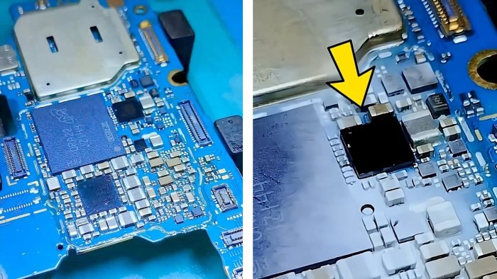 При пробитии многие детали уходят в КЗ и начинают греться. Однако из-за малых токов на плате и крошечных размеров деталей этот нагрев трудно почувствовать на ощупь. Поэтому профессиональные ремонтники используют тепловизоры. Это дорогое оборудование, которое не всем по карману. Бюджетный выход есть, как обнаружить неисправность тем что есть под рукой. Все что понадобится - это обычная канифоль и паяльник. Емкость с канифолью ставим максимально близко к тестируемой плате. Далее разогреваем паяльник, макаем в канифоль и водим дымящимся жалом над платой. Особенно над подозрительными узлами. Часть канифоли испарятся вверх, а часть оседает на элементы платы в виде белого налета. Это как раз то что нужно. И если теперь подать питание на узел или на устройство в целом, то при нагреве неисправная деталь тут же «сбросит» белый налет, ввиду расплавления микрочастиц белого налета канифоля на ней. По сравнению со спиртовым методом этот более визуализированный. В нем нет необходимости промазывать в