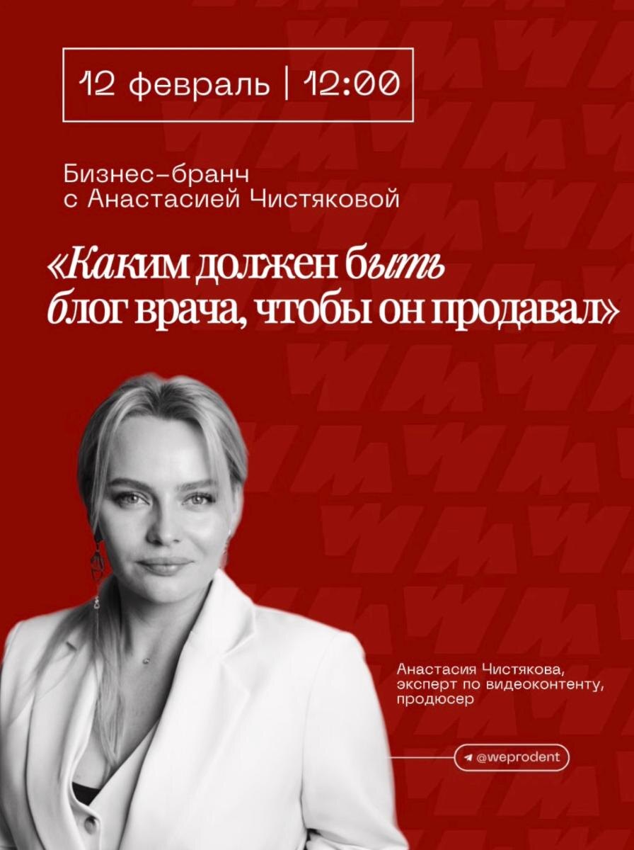 Мой продюсер, Анастасия Чистякова, проводит мастер-класс для стоматологов в стоматологическом сообществе. Полезно как и для себя, так и точки зрения знакомства с другими коллегами врачами. Если вы давно чувствуете, что экспертность есть, а понятной структуры и уверенности в контенте не хватает — формат может быть очень полезным для вас. 👉 Подробности по ссылке здесь.