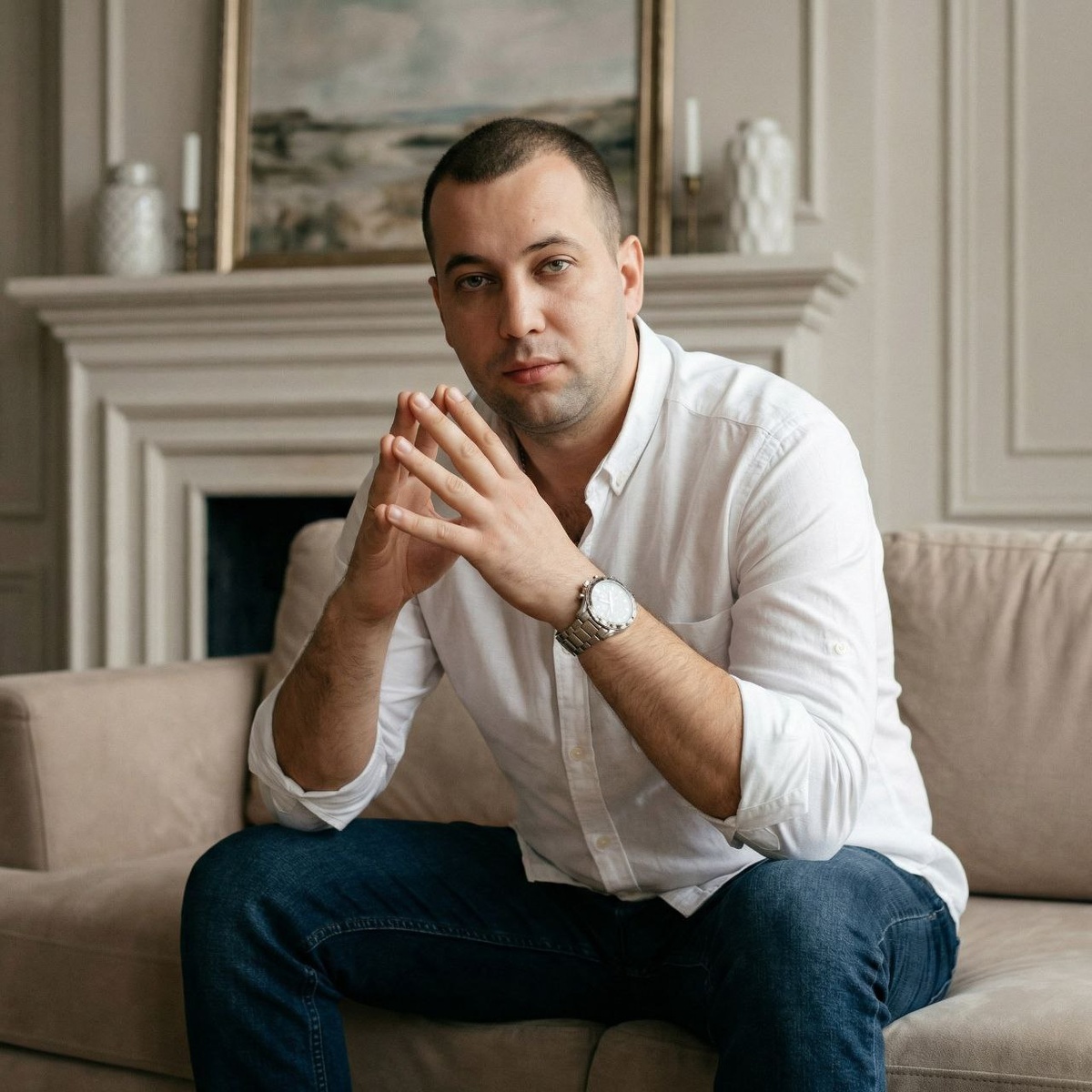 😀Выбираем "нейросети" 😀Нажимаем "Nano Banana" 😀Нажимаем "Nano Banana Pro" 😀Прикрепляем через скрепку свое фото и выбранный промпт 😀Наслаждаемся результатом😍 Создай фото не меняя черты лица и цвет волос. "Фотореалистичный интерьерный портрет: мужчина сидит на бежевом диване, слегка наклонившись вперёд, локти на коленях, руки сложены «в замок»/стюплед‑жест; надето белое приталенное рубашка‑button‑down с раскатанными рукавами и несколько расстёгнутыми пуговицами, тёмно‑синие джинсы, массивные серебристые наручные часы. Фон — элегантный каминный портал с декоративными вазы и рамная пейзажная картина, спокойная нейтральная палитра. Мягкий боковой естественный свет, shallow DOF, тёплая кинематографичная цветокоррекция, subtle film grain, высокие детали текстур ткани, кожи и металла." Камера и параметры (коротко): 50–85 мм, f/1.8–2.8, ISO100–400, выдержка ~1/125s. Негатив: no logos/text/watermarks, no артефактов, без чрезмерной ретуши, сохранить натуральные текстуры. #мужские