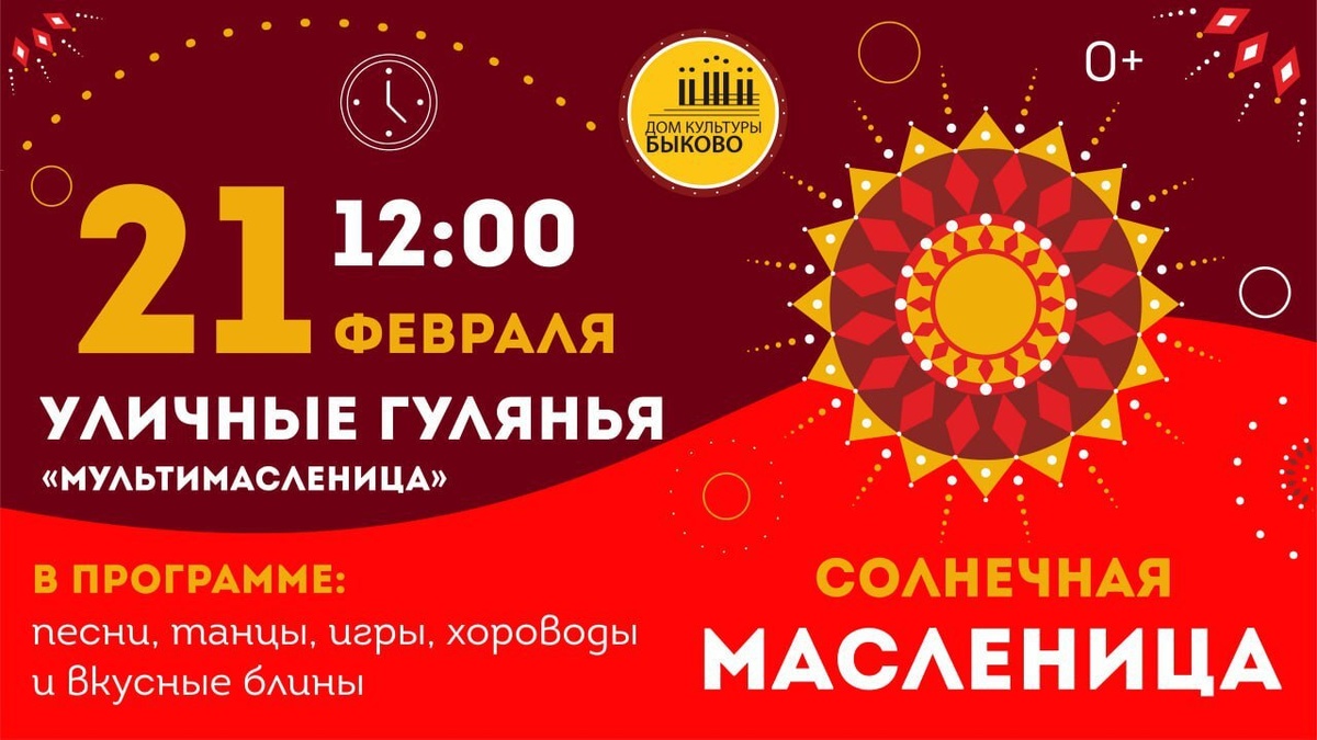 ✨ Масленичные гуляния в поселке Быково ☀️Приглашаем отпраздновать яркую и веселую Масленицу! 🥞Программа мероприятия включает зажигательные песни, заводные танцы, традиционные русские хороводы и незабываемые блины. 🤩Веселье гарантировано для всех возрастов – от маленьких гостей до взрослых! 🚫 Возраст: 0+ 📆 21.02.2026 🕒 12:00 🏢 Дом культуры «Быково» 📍 Московская обл., г. Подольск, п. Быково, ул. Школьная, д. 8 💰 Вход свободный❗️ ⭐Поддержать канал голосом 🍰Где поесть в Подольске ✅ Мероприятия Подольск https://dzen.ru/id/66ed500f7b5671493eca3fd6 http://vk.com/podolsk_events http://dzen.ru/podolsk_events