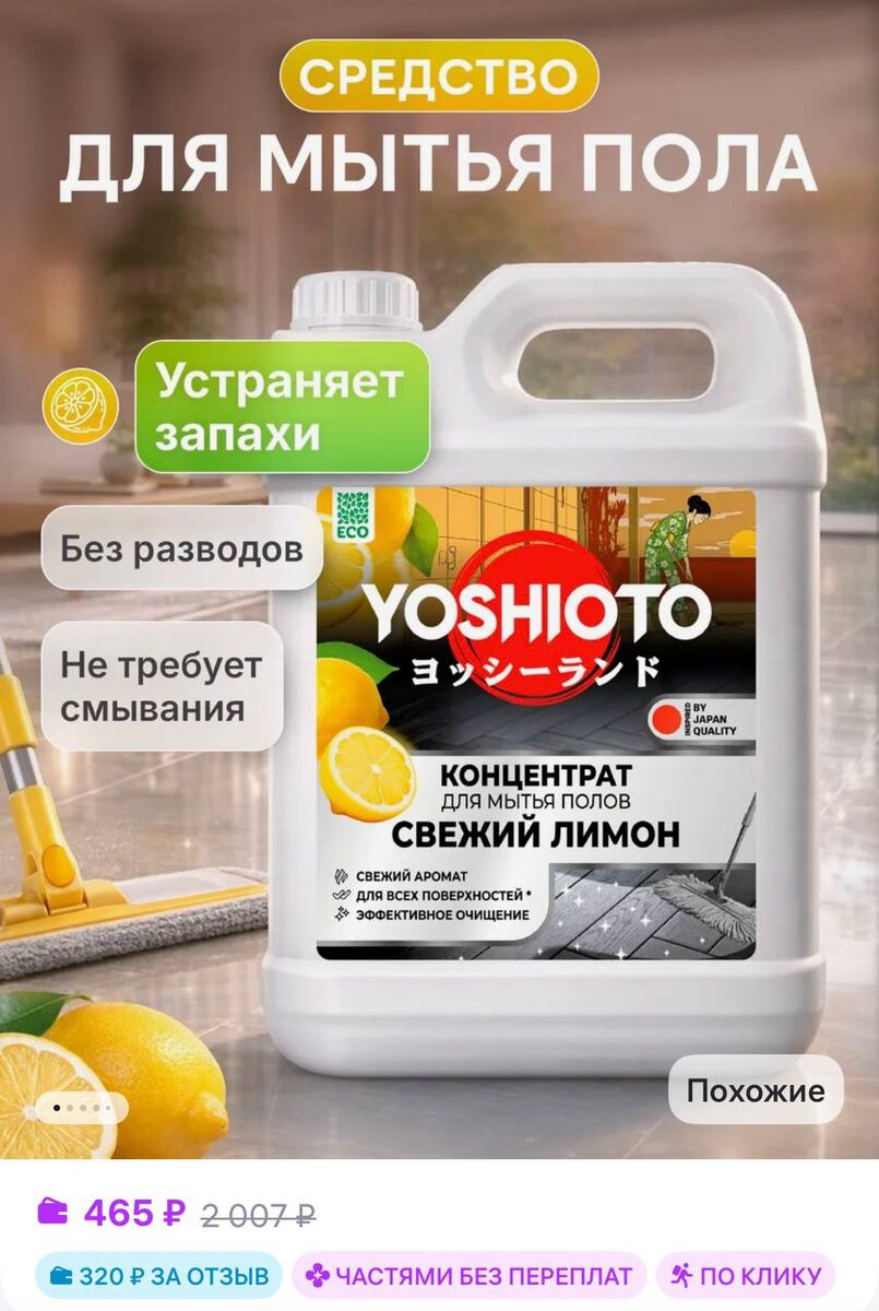 ! YOSHIOTO Средство для мытья полов Свежий Лимон, 5 кг https://www.wildberries.ru/catalog/772864580/detail.aspx?size=1133333752 ✅ Канал по скидкам 🔣 Бот с промокодами