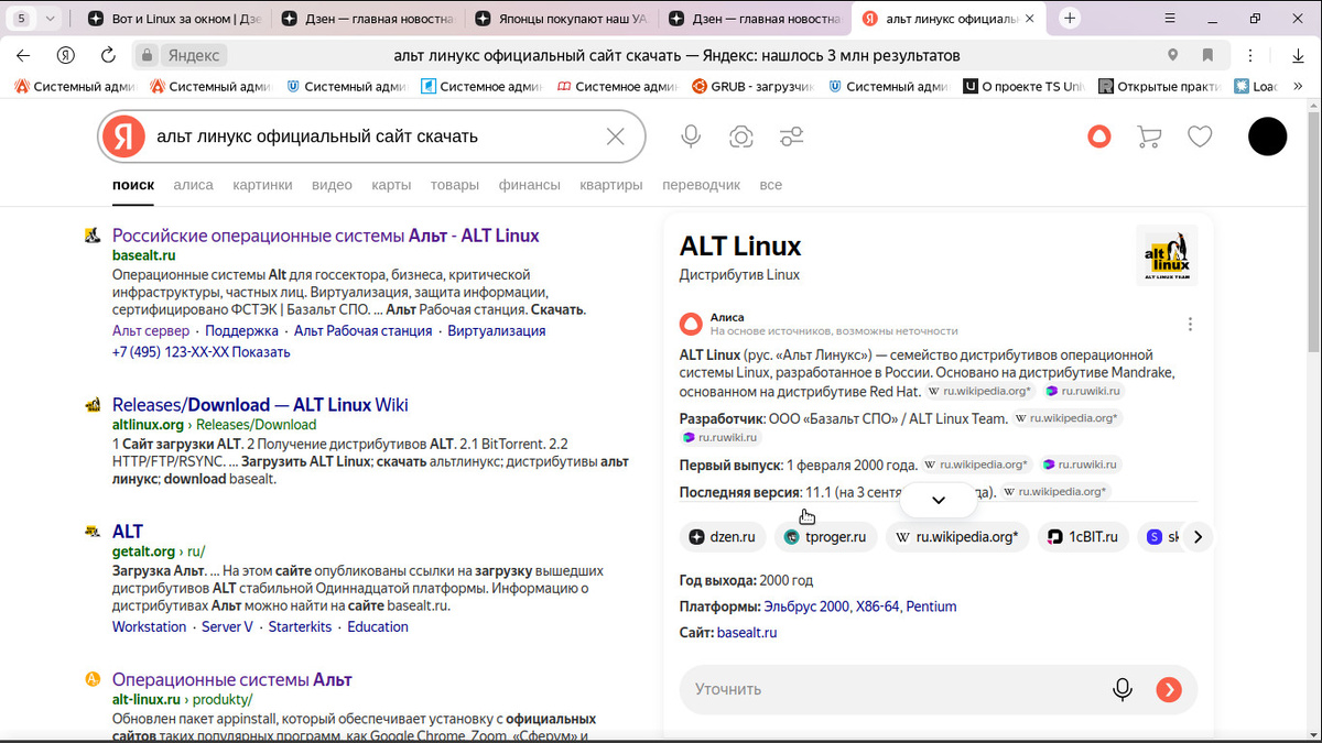 Приветствую вас, Уважаемые Читатели! Статья посвящена такой замечательной операционной системе как ALT Linux. А точнее в статье описан процесс установки системы, конкретной версии. Как можно подчерпнуть из источников в сети система построена на основе Mandrake Linux, который в свою очередь построен на Red Hat Linux. Вообще всегда питал уважение к отечественным системам, именно с силу их отечественности. И последние события показали обоснованность этого уважения. Действительно, чем больше систем, которые минимально зависят от забугорных источников, тем увереннее будут себя чувствовать рядовые пользователи и грамотные спецы на просторах нашей замечательной Родины. Именно ALT меня подкупил своей бесплатность, в отличие например от Астры. Итак приступаю к отчёту. Родным сайтом для системы считается https://www.basealt.ru/ оттуда, и начинается повествование. Идём на сайт, скачиваем ISOшники. Я скачала два сервера и две рабочих станции, но далее буду обсуждать установку alt-workstation-11.