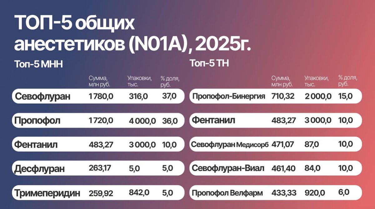 Топ-5 лидеров общей анестезии (МНН и ТН) по объёму продаж в 2025 году💊