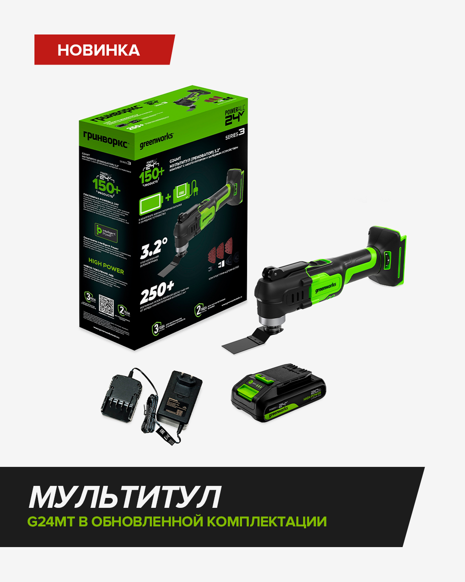Один инструмент — десятки задач. Аккумуляторный мультитул Greenworks G24MT (3400307CUA) из линейки POWERALL 24V подходит для резки, подрезки и шлифовки в труднодоступных местах, где обычный инструмент бессилен. ✅ Частота колебаний 5 000–18 000/мин с регулировкой под материал 🔄 Угол колебаний 3,2° — точные погружные резы и работа заподлицо Продумано для удобной работы: ✅ Бесключевая смена оснастки ✅ LED-подсветка рабочей зоны ✅ Поддержание частоты под нагрузкой ✅ Защита от перегрузки и перегрева ✅Компактный корпус — удобно работать в нишах и углах ✅ Совместим со всеми аккумуляторами платформы POWERALL 24V ✅ Гарантия на инструмент — 3 года, на АКБ — 2 года 💰 РРЦ: 10 490 руб. Приобрести можно в онлайн и офлайн-магазинах: Ozon, Wildberries, Яндекс Маркет Greenworks G24MT — универсальное решение, когда важны точность, контроль и доступ к сложным зонам. #greenworksrussia #аккумуляторнаятехника #переходиназелёный #мультитул