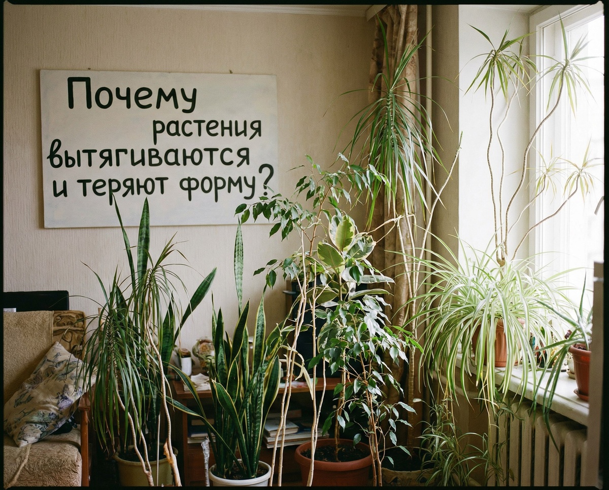 В таких условиях растение думает, что сейчас сезон активного роста, но ресурсов для него нет. Итог — вытягивание.