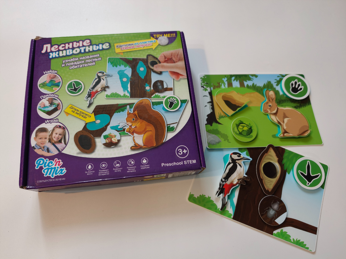 Классный наборчик от не менее классного производителя, включающий 8 карточек с разными зверушками, их едой, домиками и следами. Позволяет расширить кругозор ребенка, а также делать любый многими подбор изображений по силуэтам. Со следами есть подсказка в инструкции, без нее было бы и взрослому сложно😄.