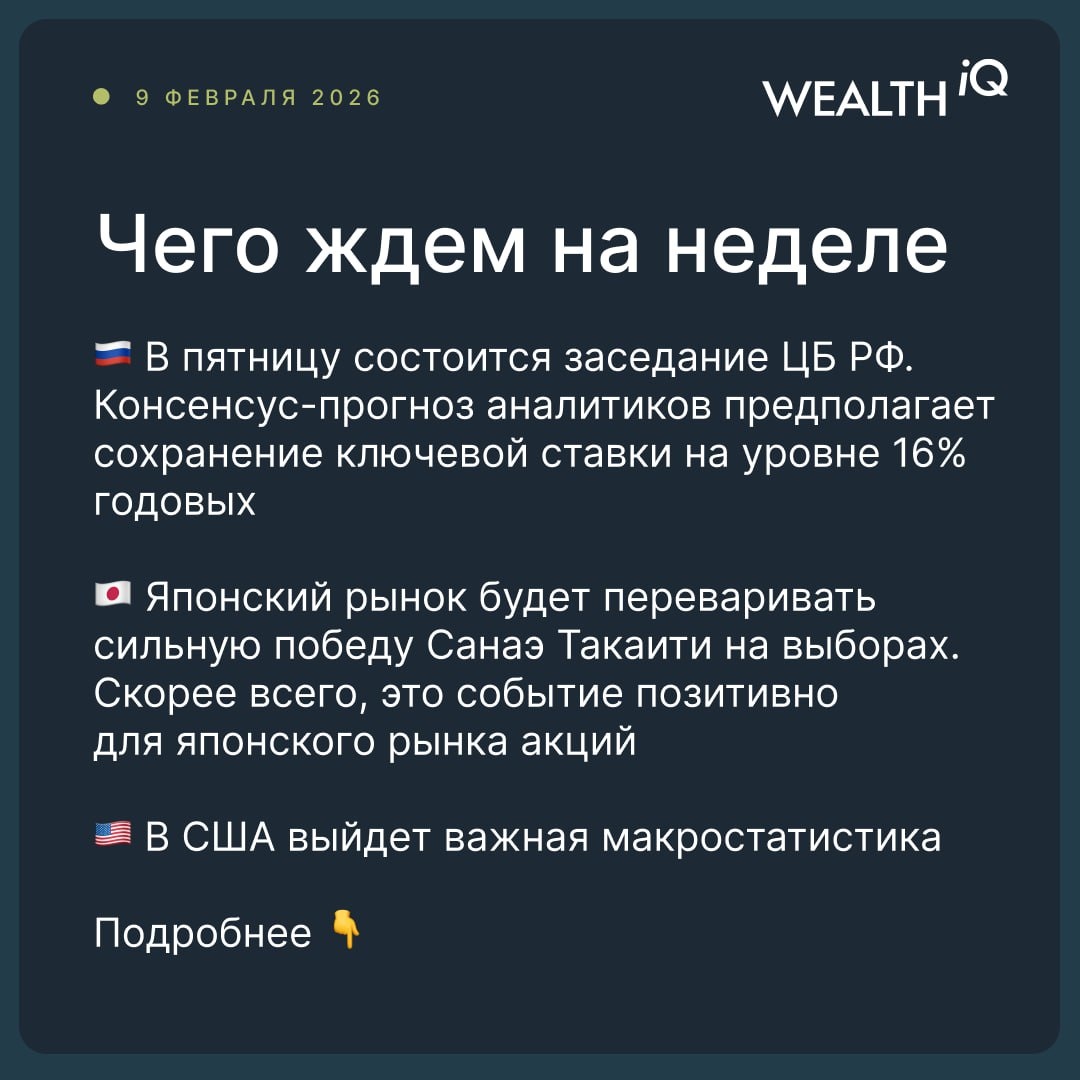 🇷🇺Россия: заседание Центробанка, инфляция, корпоративная отчетность В пятницу состоится заседание Банка России. Консенсус-прогноз аналитиков предполагает сохранение ключевой ставки на уровне 16% годовых. В среду Росстат опубликует данные по инфляции за неделю с окончанием 9 февраля, в пятницу — за январь. В понедельник «Лента» представит операционные результаты за 2025 год, во вторник выйдут результаты «Сбера» за январь 2026 года, в среду «Норникель» опубликует свои финансовые результаты за прошедший год. 🇯🇵Японский рынок на этой неделе будет переваривать неожиданно сильную победу Санаэ Такаити на выборах. Скорее всего, это событие позитивно для японского рынка акций. 🇺🇸В США главными релизами на этой неделе будут данные по продажам в ретейле и январская статистика по рынку труда. В пятницу выйдут данные по инфляции. Сезон отчетности переходит к потребительскому сектору. Хедлайнеры — McDonald's и Coca-Сola. #НеделяНачинается 🏦 @wealth_iqs