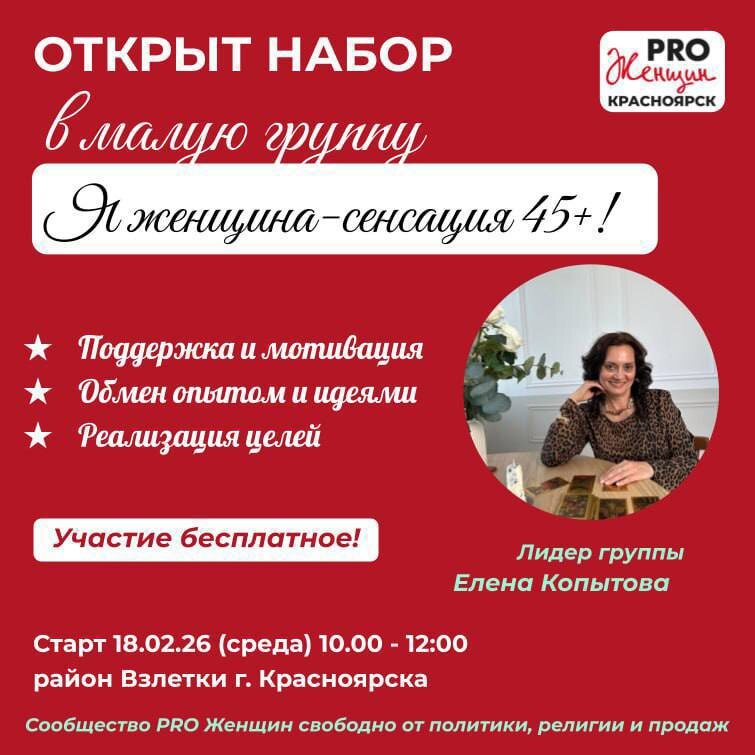 ❗️❗️❗️ 🔔 ОТКРЫТ ДОНАБОР В МАЛУЮ ГРУППУ ЕЛЕНЫ КОПЫТОВОЙ «Я Женщина сенсация 45+!» Участие безоплатное! 🎁 Если вы хотите заявить миру о себе, стать женщиной сенсацией и при этом быть в ресурсном состоянии присоединяетесь к нашей душевной группе! Мы вместе: 💕 Создадим искреннее намерение 💕 Поможем друг другу выйти из зоны комфорта 💕 Прикоснёмся к состоянию вдохновлённой и ресурсной женщины 💕 Сделаем практики для поднятия энергии 💕 Поддержим друг друга в любых начинаниях 💕 Поиграем в интересную игру, после которой закрутится ваше колесо жизни Группа будет проходить по методологии сообщества PRO Женщин, которое объединяет и помогает женщинам заявить о себе ✔ Старт 18 февраля 10:00-12:00 ✔ Встречи будут по средам ✔ Еженедельно, 6 встреч ✔ Уютные кафе в районе Взлётки г.Красноярск ⭐️ Если хотите присоединиться или задать вопрос, пишите лидеру группы Елене Копытовой в личные сообщения @Elen_boginy В малых группах нашего сообщества Вы получите мощный ресурс - поддерживающее окру