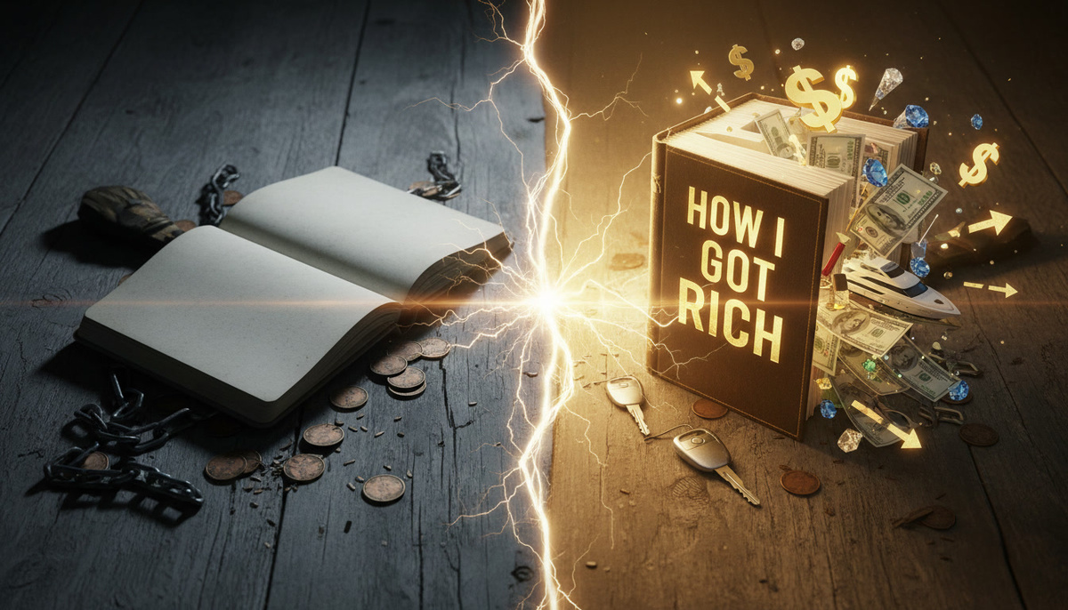 Посмотри на картинку: книга-бестселлер "Как я стал богатым" и рядом стопка пустых тетрадей. Чувствуешь разницу? Одна история уже написана, продана и приносит деньги. Другие – ждут своего часа, но пока они пусты, они ничего не стоят.